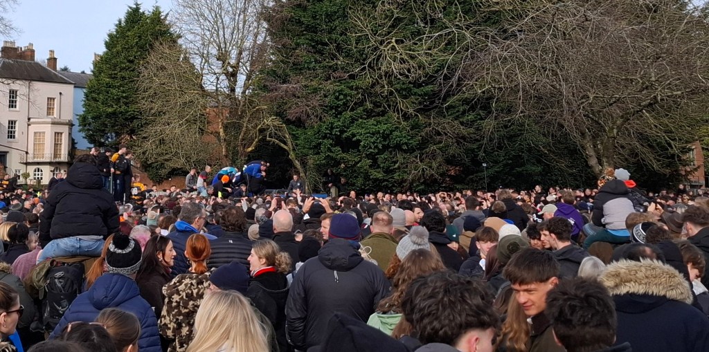 People now were drifting towards Shawcroft car park where a permanent plinth stands for the officials to send the ball into the competitors on Shrove Tuesday and Ash Wednesday. The game is played between 2 pm and 10 pm although if the ball is grounded any time after 6 the game ends earlier. The teams are made up of people born in opposite ends of town, the UP’Ards and the Down’Ards. The ball has been traditionally made of three panel of leather of varying thicknesses, stuffed to a weight decided by the maker. 2026 saw the Tuesday ball made by Terry Brown, the recent maker, but the Wednesday ball was to be made by newcomer Carl Spencer to bring fresh blood into the process for future continuity.