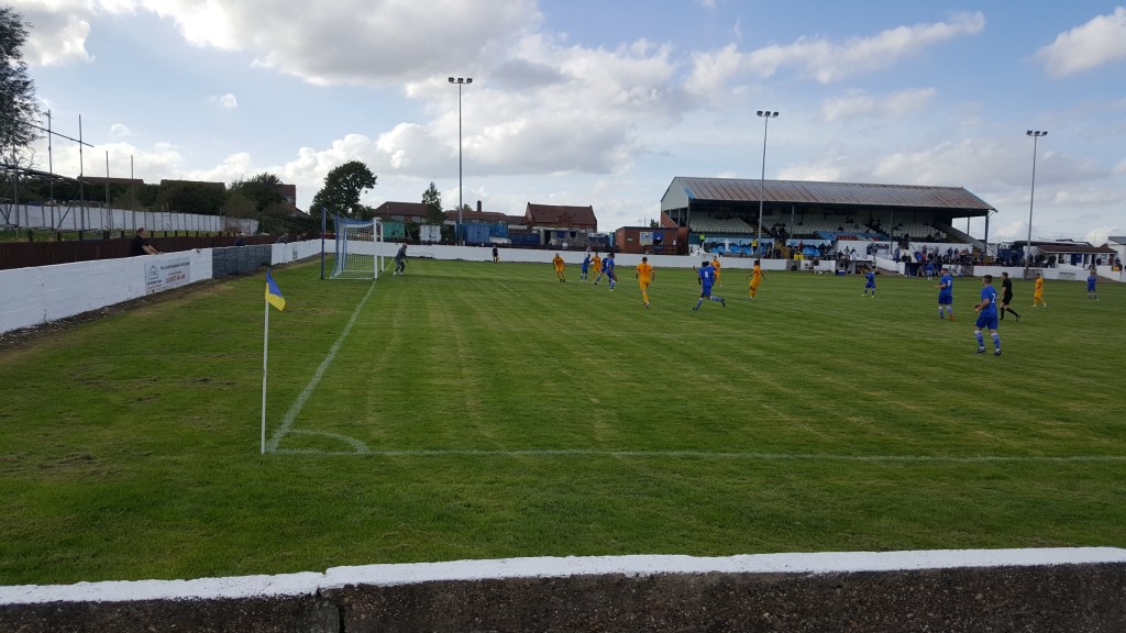 It was good to be seeing my first live game since March and it was a glorious end of summer day with blue skies and some high cloud. Sitting in the large stand the ground looked as if it had been lovingly worked on since the last game with lots of newly painted areas. The pitch was immaculate and looked very flat until I walked round the perimeter to see a large slope existed from the stand to the far edge of the pitch.