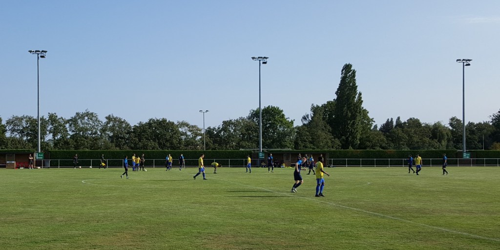 I made the trip to see Northampton Sileby Rangers F.C. play Bedfont and Feltham F.C. in the F.A. Vase first qualifying round. Sileby play at Fernie Fields in Northern Northampton perhaps the best kept ground I have ever visited at this level of Football. The pitch was lush, thick , flat grass that looked vivid green against the clear blue sky. The hedges on two sides of the ground are immaculately clipped and a spirit level must have been used to get them so perfect. The club house and catering facilities were spotless and even the fact that they didn’t do chips couldn’t spoilt it. The gateman and the catering staff couldn’t have been friendlier or more helpful. Only a breeze kept the temperature down as we drifed towards autumn.