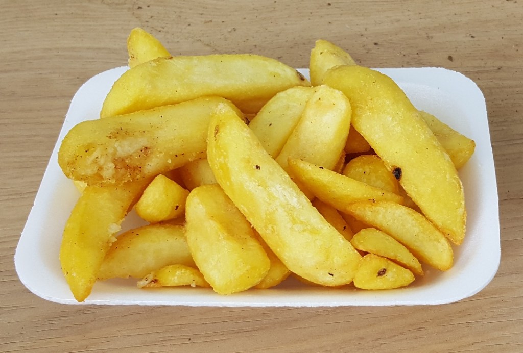 The chips were hot, large, thick, no taste of grease but with a squashy mess inside. Unfortunately I scored a lowly 50 when in this town in the fenland with much food growing, processing and distribution I expected more.