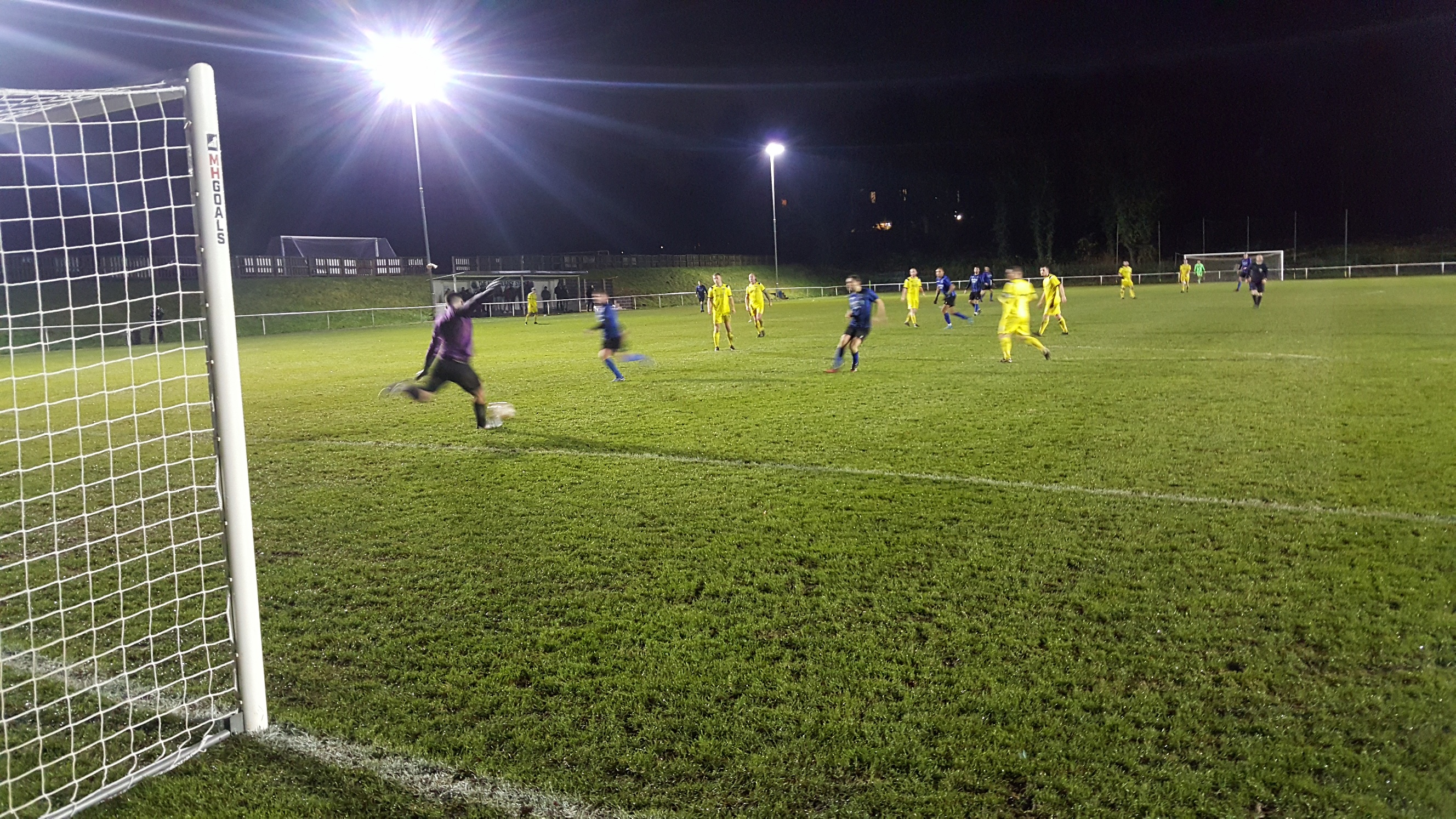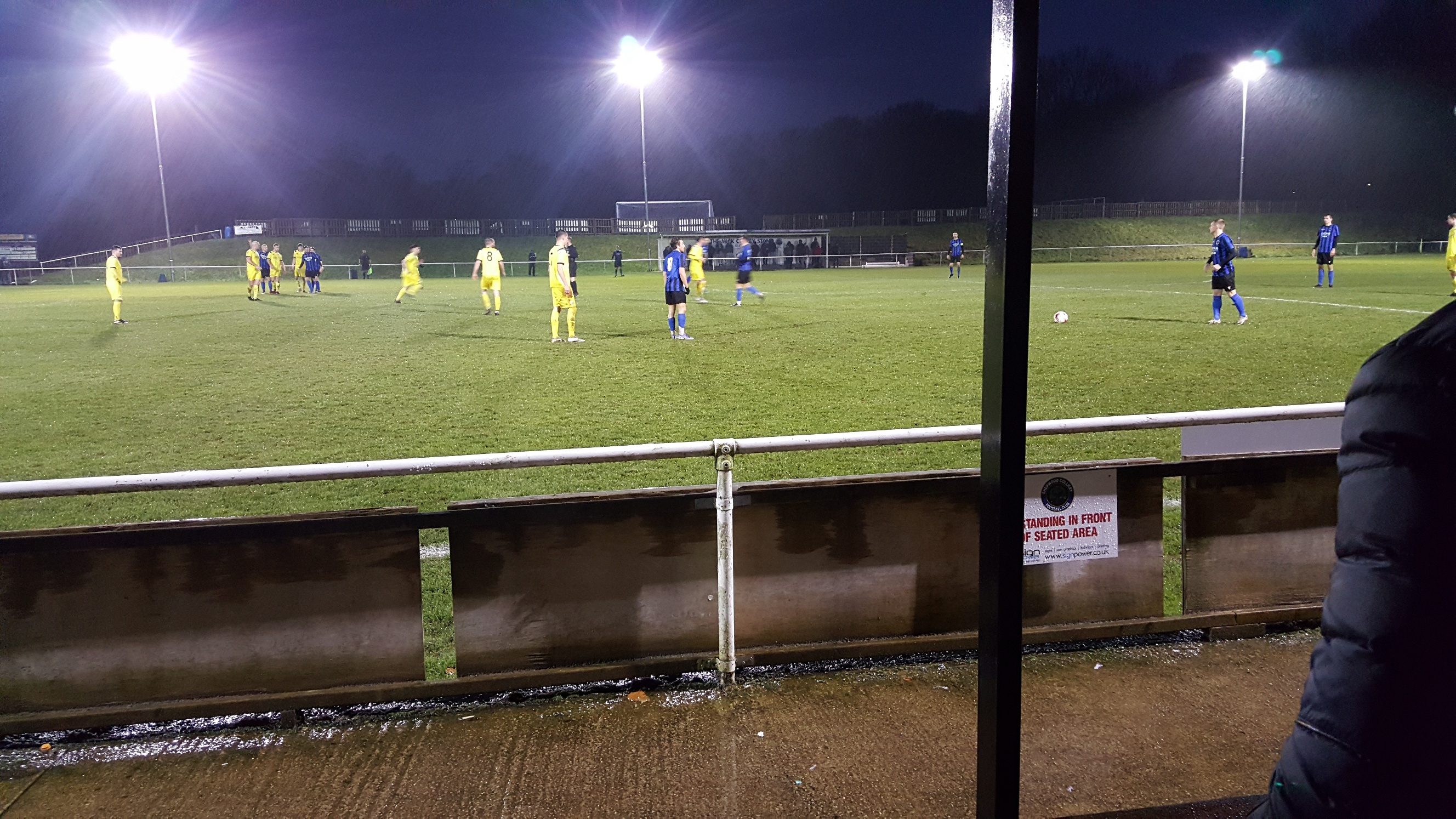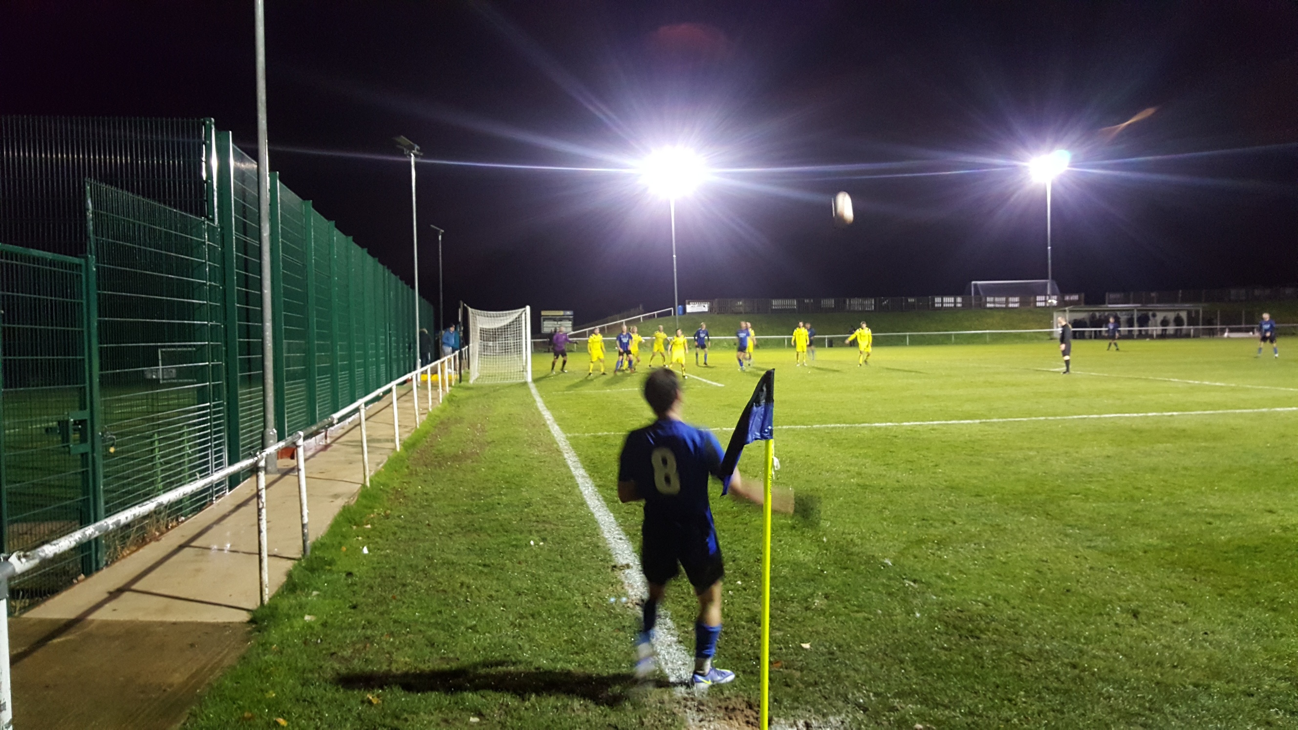 I shouldn’t have said that it was amazing how mild it had been at recent football matches this autumn. My trip to Burnley was wet but Saturday’s visit to Mansfield Woodhouse to see Sherwood Colliery play Knaresborough Town was almost monsoon like. Getting out of the car to avoid puddles was the first hurdle and I made my way through the club house to the ground behind in gloomy light at only just before three in the afternoon. The 50 brave souls were able to take cover under the two covered areas on opposite sides of the pitch.