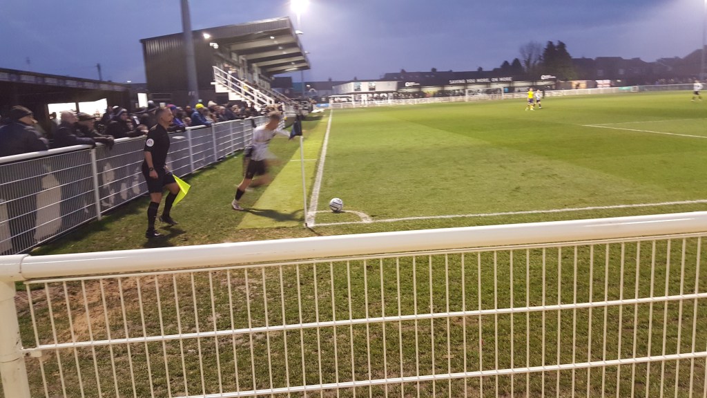 Being dropped off at Brewery Field the first impressions of Spennymoor Towns ground was not a disapointment. When you go inside everywhere is painted black to match the teams black and white colours and is spotless, all the terrace edges and steps have yellow edging for safety and the perimeter tarmac was faultless. There is a large seated stand in the centre of one side , covered seating behind one goal with standing on two sides which is covered behind the other goal. The clubhouse was busy with a mix of home and away supporters and there were covered hot food and drink kiosks in opposing corners, all in all, impressive.