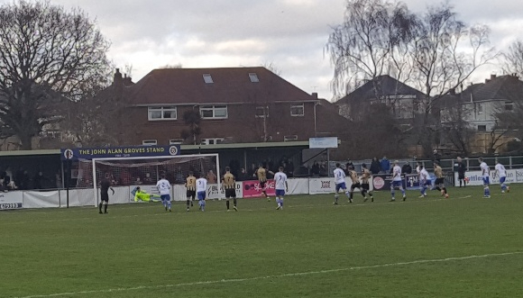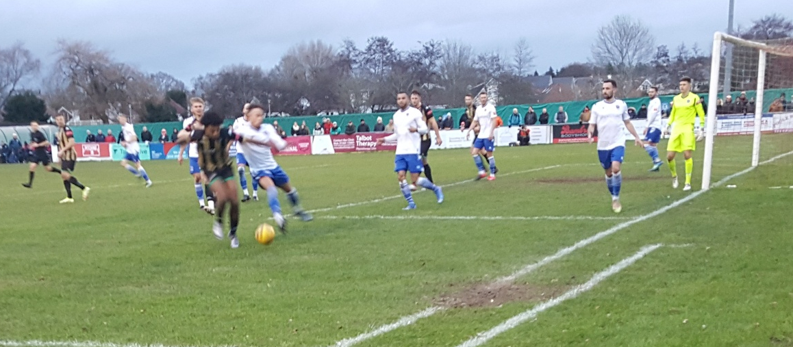 A small knott of Poole ultras began chanting in time to an incessant drum beat to get the game under way and the home team were soon on top when on only 5 minutes Jack Dickson dribbled in from the right only to be up ended by a defender and Will Spetch sent the goalkeeper the wrong way to convert the awarded penalty.