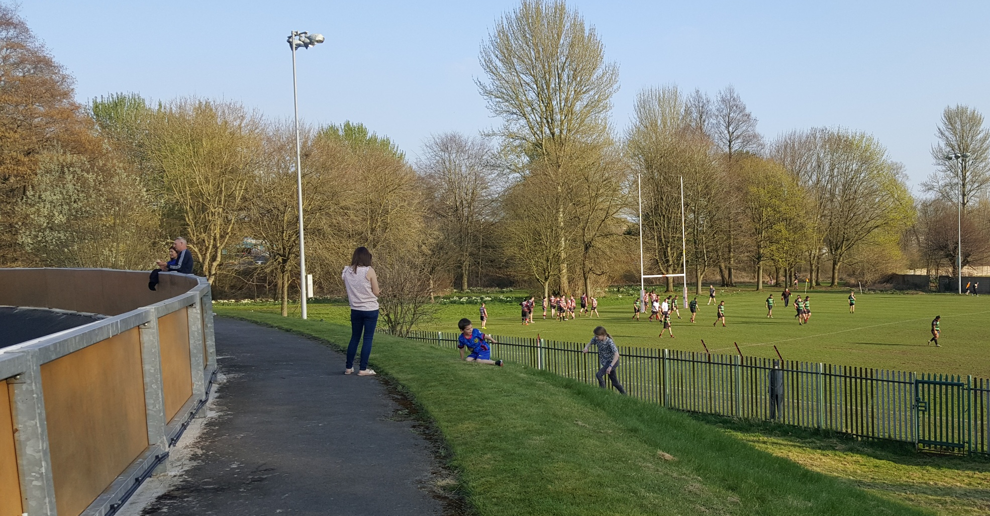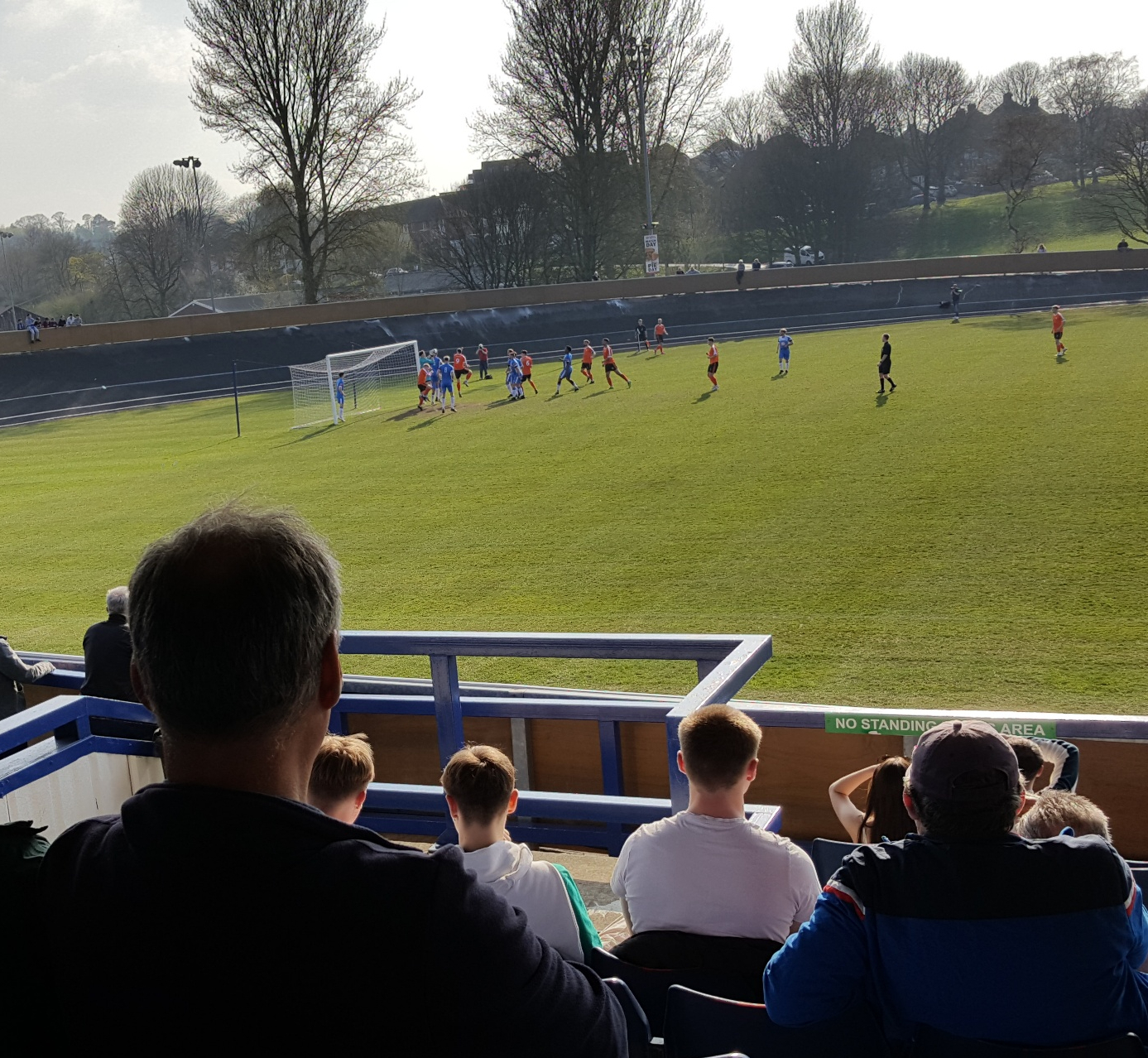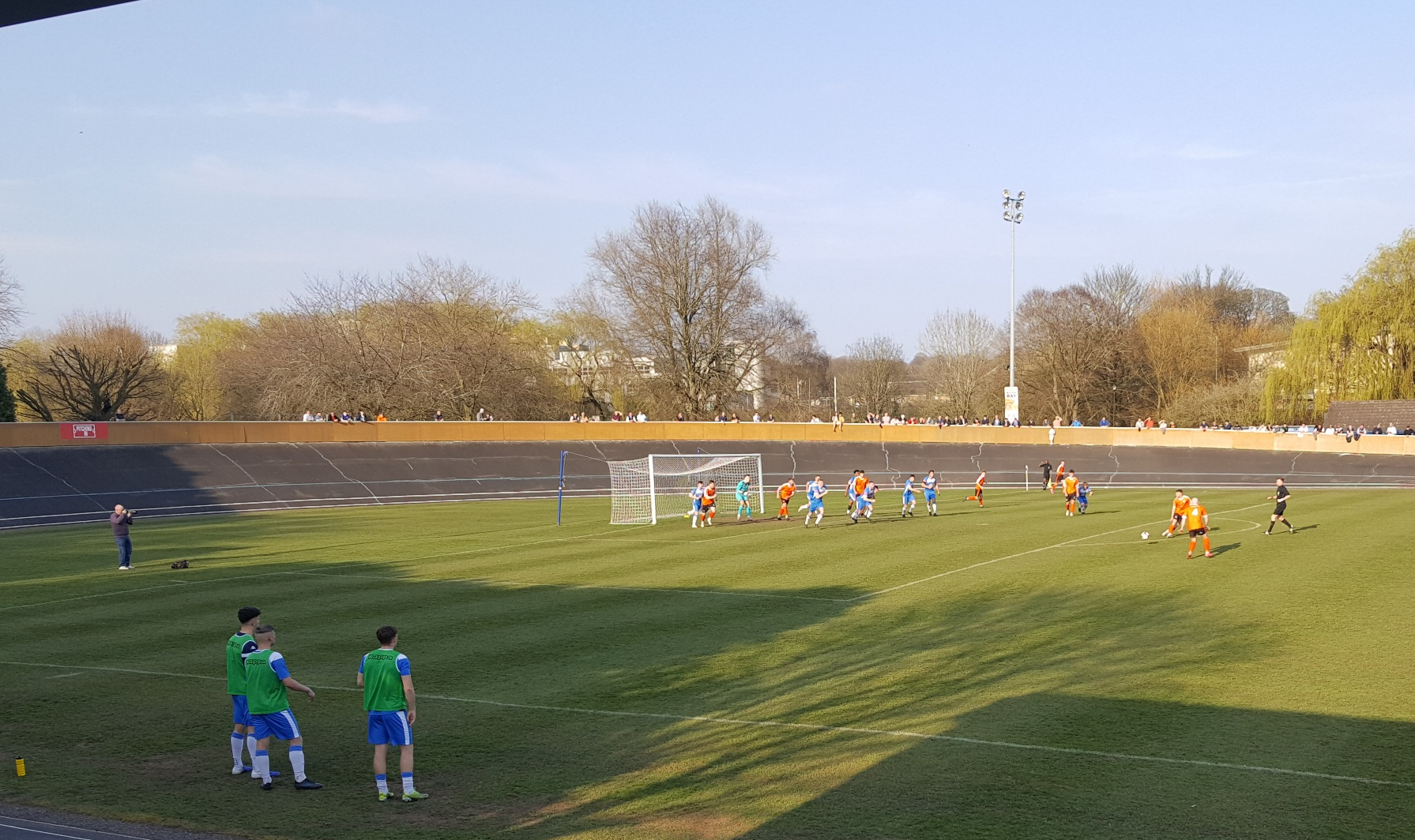 The ground is in a very large park with other sports pitches and facilities and it is unusual because it has a velodrome all around the perimeter and therefore feels spacious but I did not feel that this made it a bit removed from the pitch. The pitch was very flat and green and all around there is hard standing at different heights depending on the curve of the cycling track. In the middle of one side behind the dugouts is a covered standing area and there is a seating area on the other side.