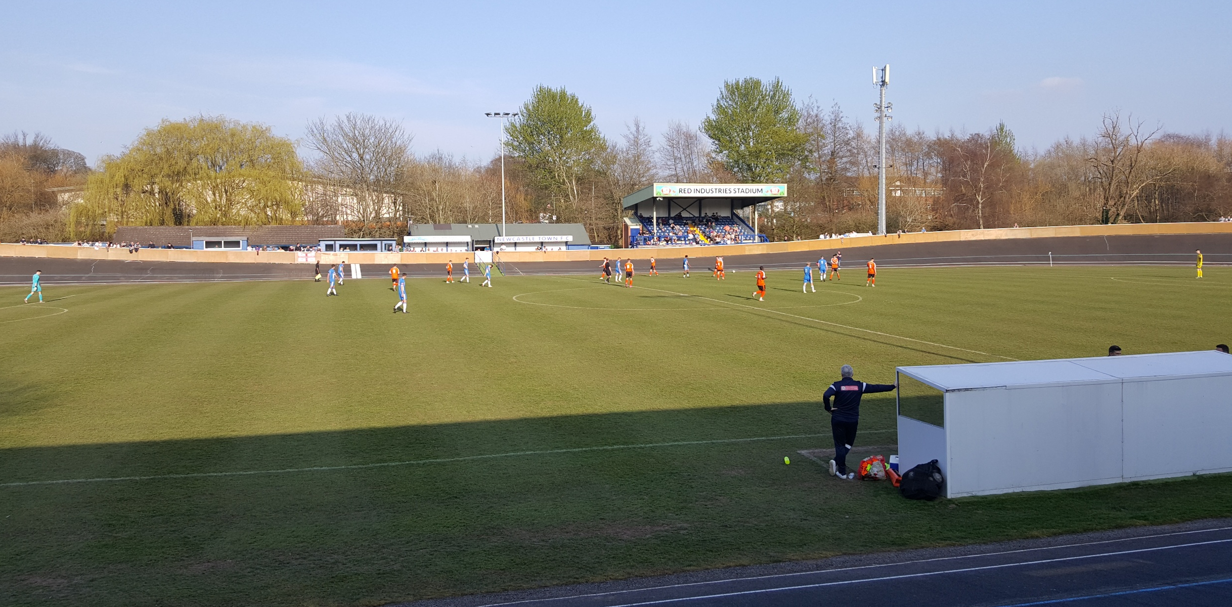 Parking in the centre of Newcastle under Lyme I decided to take the 18 minute walk to the game because the weather although hazy was a beautiful 19 degrees with no wind. With 50 minutes to kick off it seemed a cinch looking at Google maps. I decided to take a short cut through the cemetery but as I entered the cool I lost signal. It was peaceful walking through in the tree lined paths but totally disorientating. After being sent the wrong way by a helpful passer by my signal returned and I found that I had gone totally off piste. After finding my way back to where I started I was running out of time so I quickened my pace and eventually walked through the gate to the ground with a minute to spare.