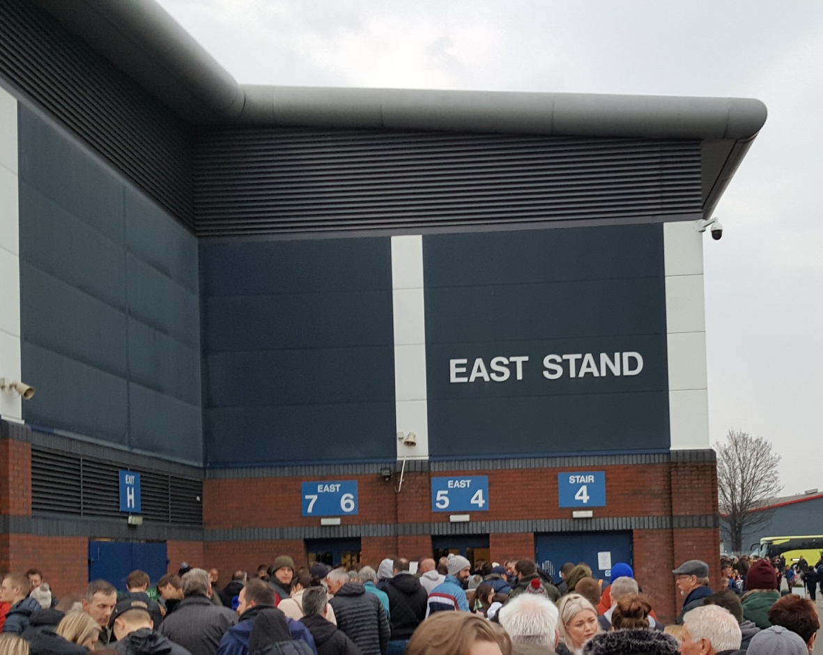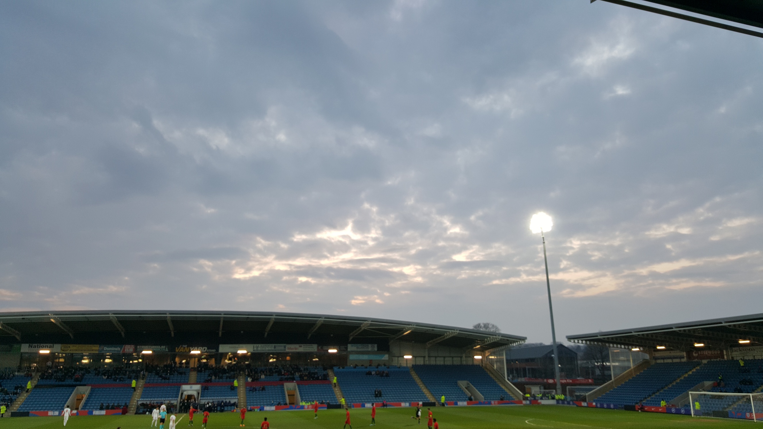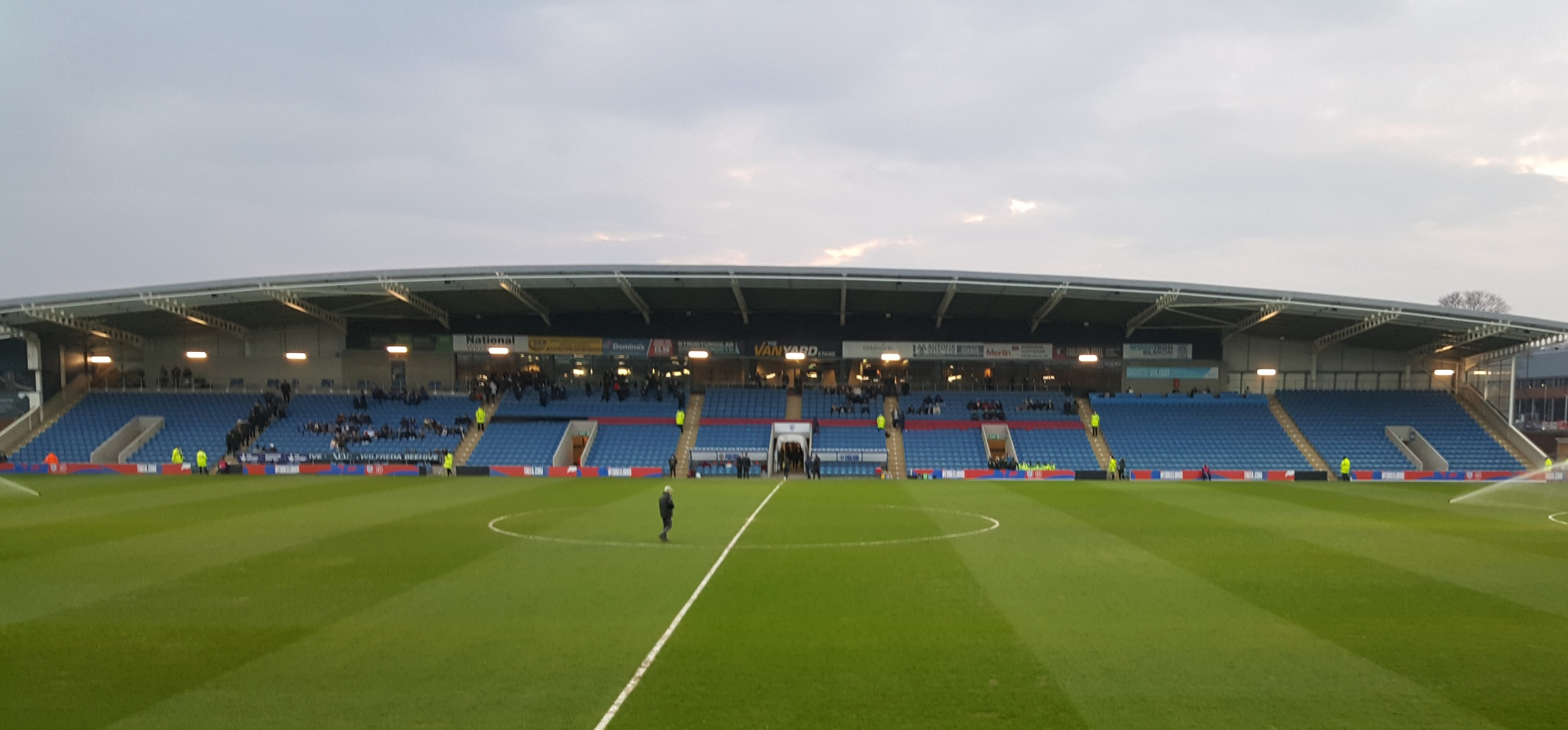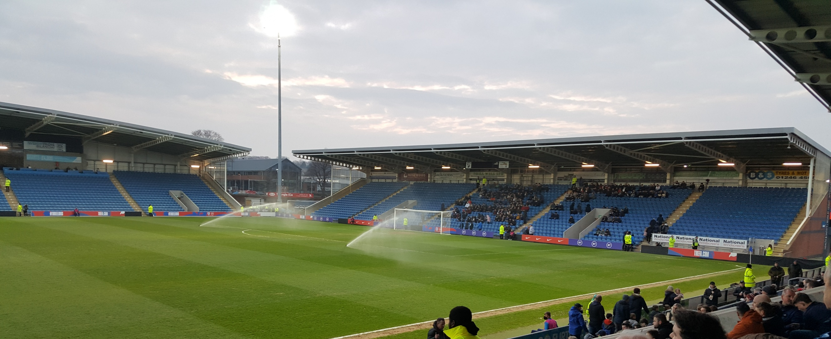 After a few glorious days fans were pleased to have dressed for a wind that was quickly reducing the temperature. Chesterfield’s pitch is perfectly flat and against local reports I was pleased to find that only the immediate goal areas were sanded on what looked a green thick turf.