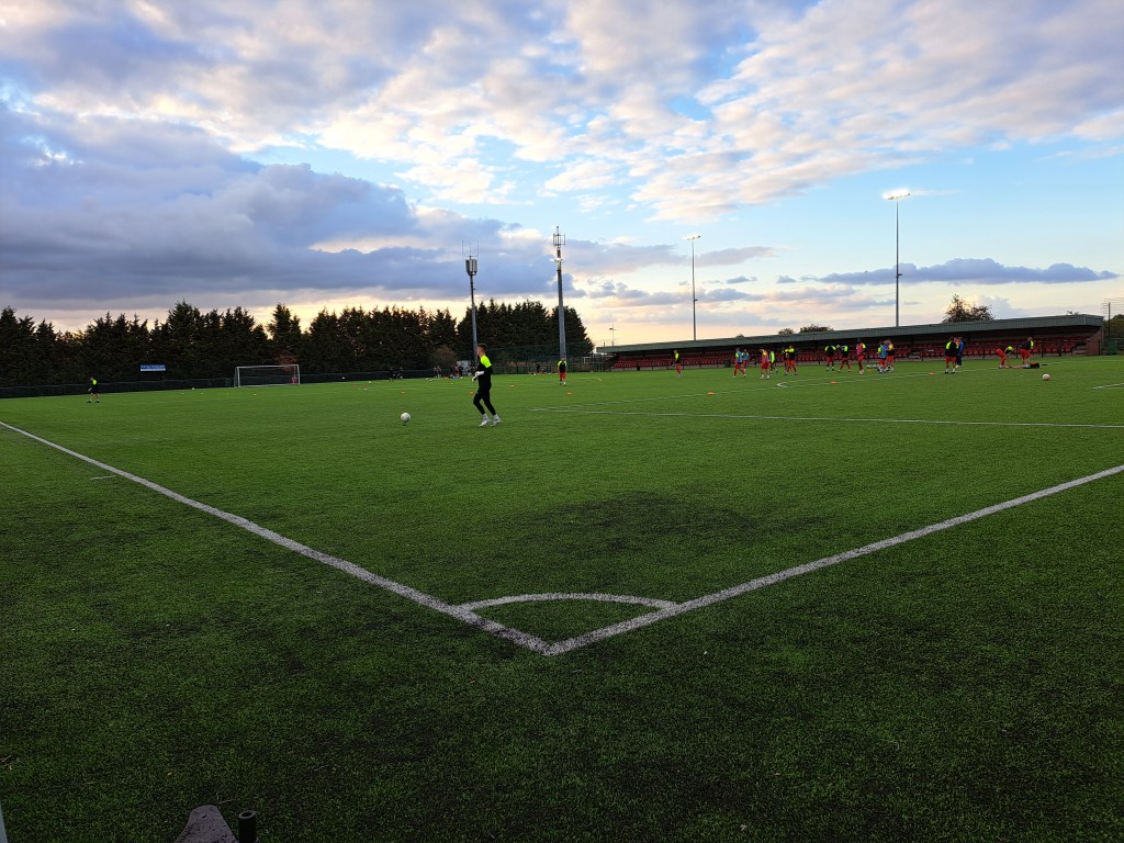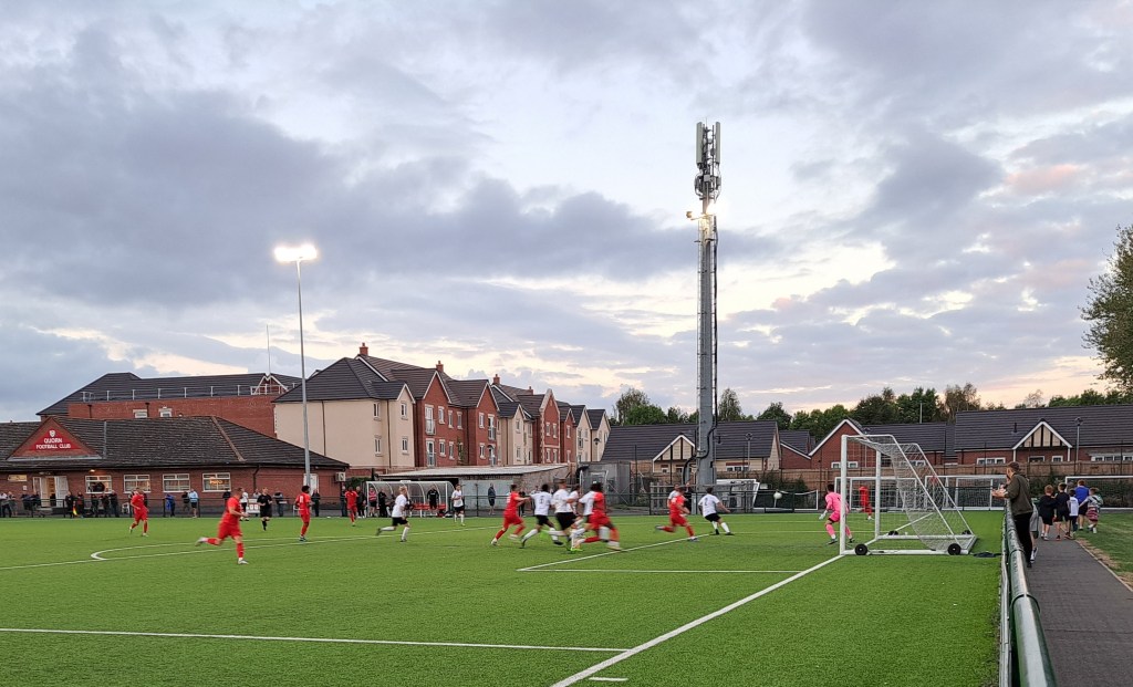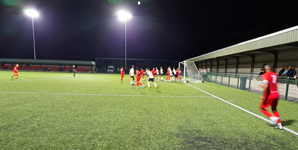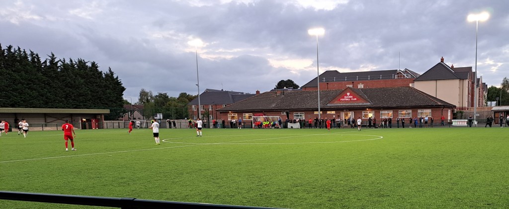 Quorn’s ground is impressive for this level of football, there is hard standing all around, a covered standing area at one end and a covered seating area that runs almost the full length of one side and a very well appointed club house for the public and officials on another side. The pitch is a modern synthetic surface that has a very slight fall from end to end and from side to side. There are three mobile phone masts within the ground, two of which also have floodlights attached. Although there were a few spots of rain on getting out of the car the evening turned out warm, dry and with little wind.