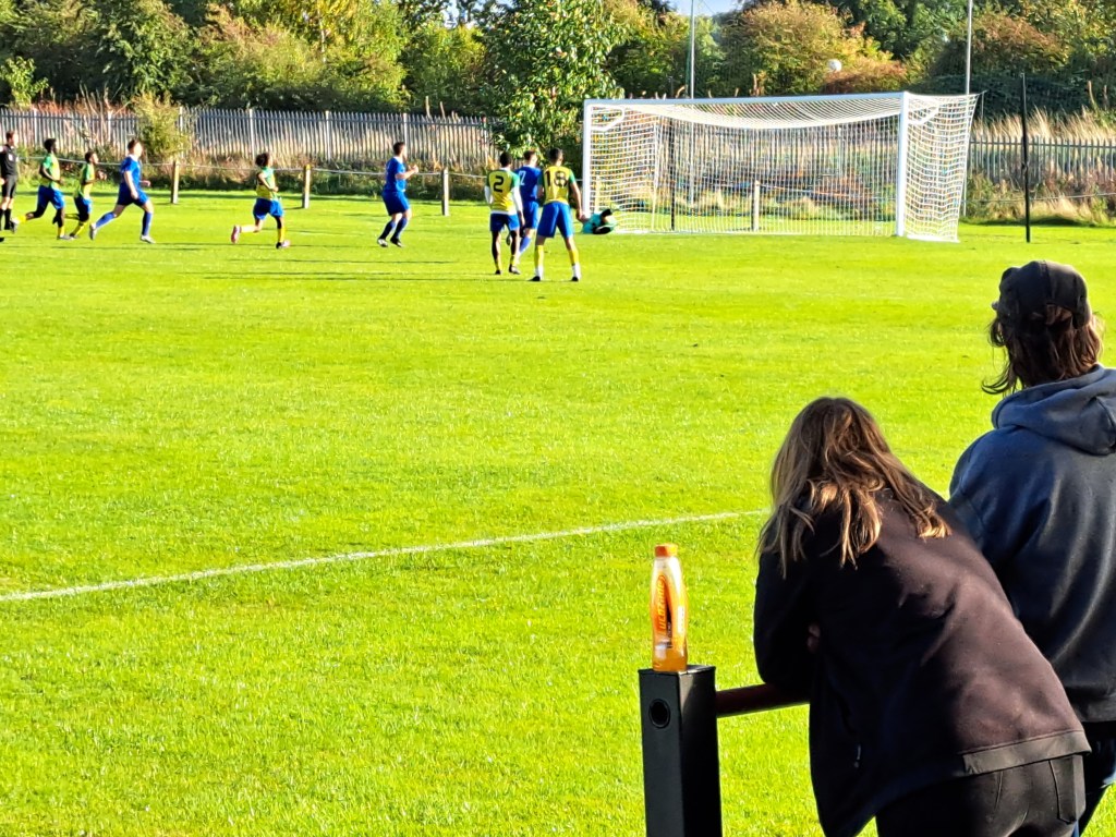 Sheffield dominated the first half with some very intricate play and made it difficult for South Kirkby to clear their lines and mount any forward counter attacks. Sheffield seemed to be trying to create the perfect goal, perhaps it was their Brazil look a like kit, with some great inter passing, running and ball skills but they failed with the final pass and a phobia about shooting at the goal. The half’s excitement was the size of the crowd, to start with there were 3 of us but every couple of minute a few more turned up until at one time there were 21.