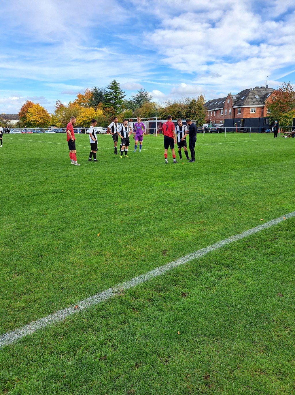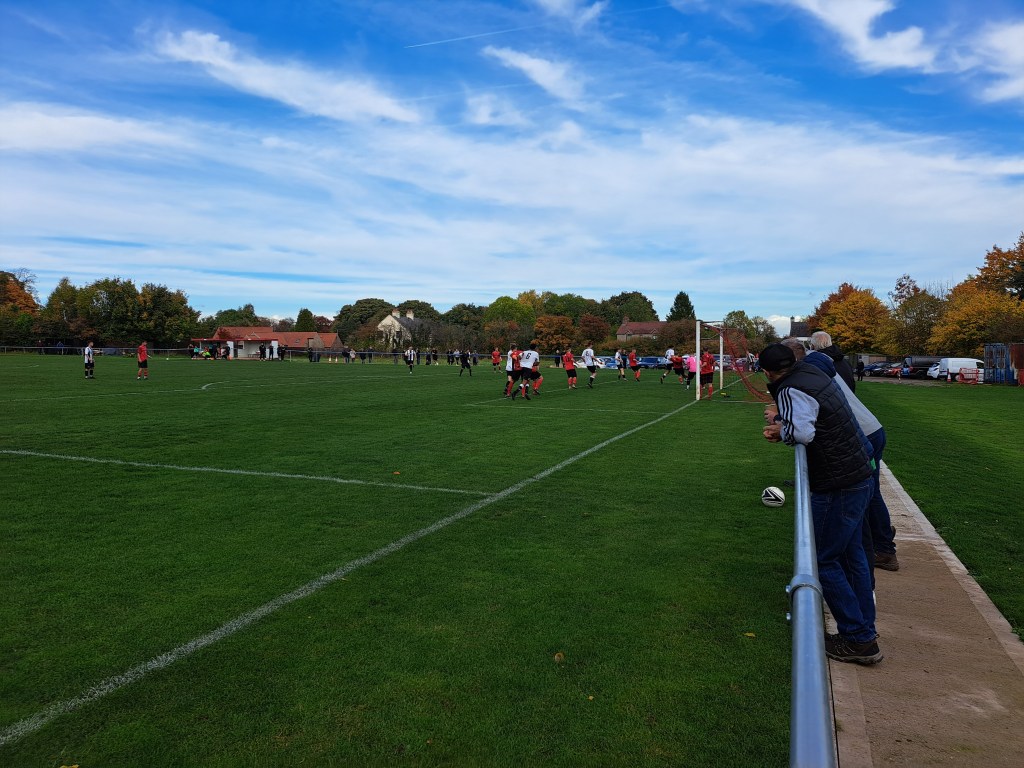 It was a beautiful day at Linby as some grey cotton wool clouds crept across from the motorway along with the occasional cold burst. This is a picturesque ground with good parking for players officials and the 40 plus fans who came to watch. There were railings round the playing area with concrete hard standing round half the pitch which was a lush green, quite flat with some undulating areas. There is a changing block for the players and a small club house across one corner. No chips here but a welcome coffee and a chat with a referee assessor.