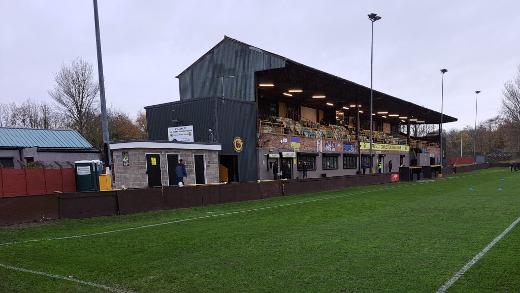 It was a dull grey day with some slight drizzle in the air and although the Met Office App was saying it was 11 degrees I think they must have been measuring it indoors. The pitch looked flat but the grass was beginning to wear after the rain of the last month. What hits you first is the high, large, seated stand that runs down most of one side under which are the changing rooms, snack bar and club house. The other three sides were terraced with a small covered standing area over half of one end.