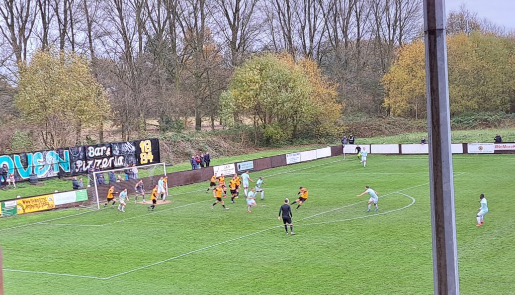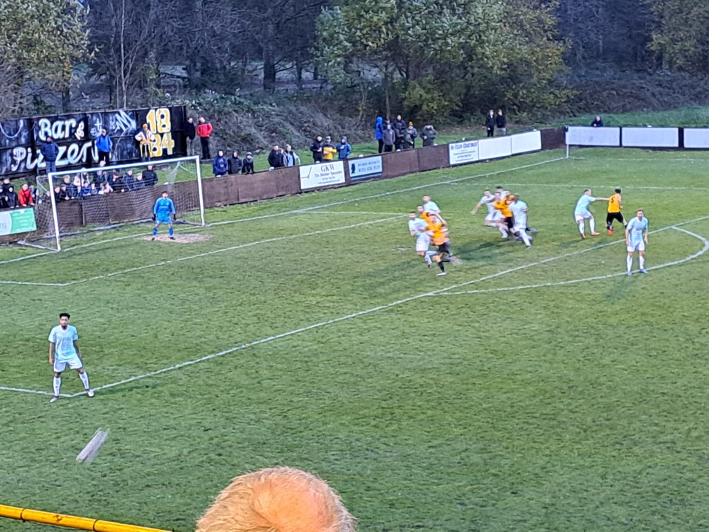 Just after another Macclesfield attack Prescot were awarded a free kick out on the right touchline, some 35 yards plus out. James Edgar hit the ball into the centre and it sailed over everyone into the top left hand corner of the goal for a home team lead, could this be real! The euphoria of the home crowd only lasted a minute as James Berry through on goal chipped Allen but the ball hit the cross bar and dropped down for Berry to run through and tap it in for the equaliser. The game was now getting more competitive and you couldn’t tell that it was Prescot who had the ten men. It could have been ten each when a bad foul in midfield ended in a scrum of players with the Prescot centre back being booked for some jostling with the perpetrator of the foul slinking off early and avoiding a second yellow. Macclesfield substituted the player immediately afterwards.