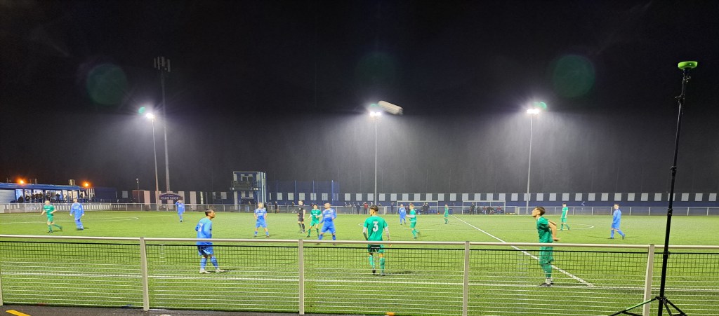Chesterfield did come more into it at the mid point of the half but they lacked any cutting edge and didn’t bother the away teams defense. The left full back for Belper was now playing more as a constant overlapping winger and one of his crosses was headed just over on 35 minutes. But two minutes later the inevitable happened as he again flashed in a cross which this time was met by Josh Gregory who right footed put the ball beyond the diving keeper into the left hand corner of the goal. So a deserved half time lead for Belper who came off the pitch to torrential rain.