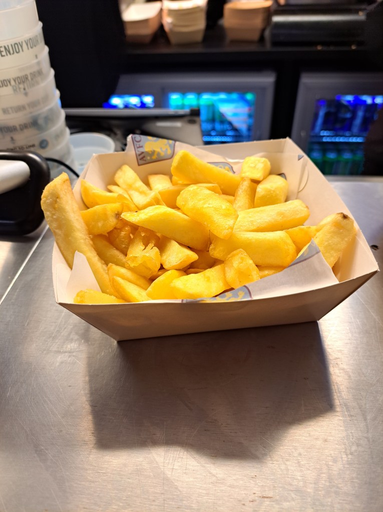 Tickets for the FA Cup third round game we had come to watch were £20 everywhere and we had chosen to sit high up in the Trinity Road Stand. Villa Park is now so different in that everything shines in its cleanliness, even the toilets. The last time I visited Villa they had no chips but this time they were there and with a Balti Chicken pie were today’s Sunday lunch as I would not be back home till 20.30. The large queue for food was soon dealt with and the pie was hot, full of filling and tasty and the chips were a delight too, hot, golden, thick, soft in the middle and tasty for a score in my chip league of 72. If the centre had been a little harder they would have been the best chips for years.
