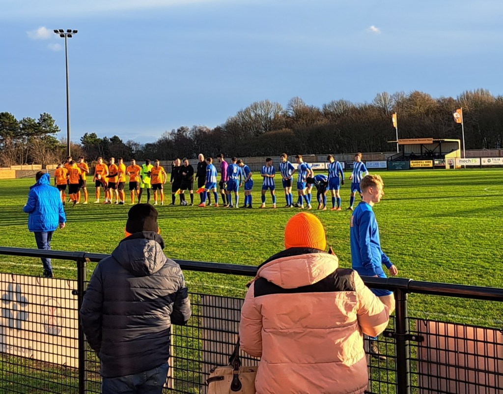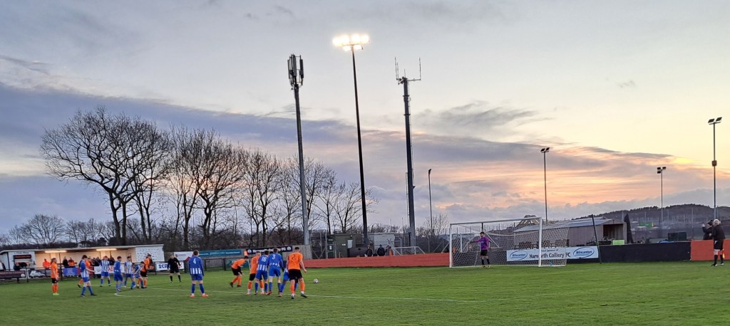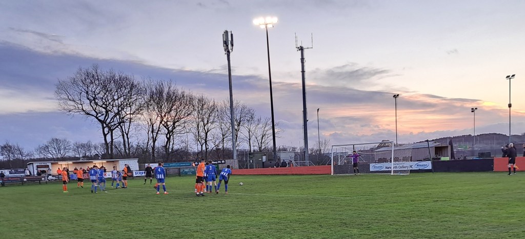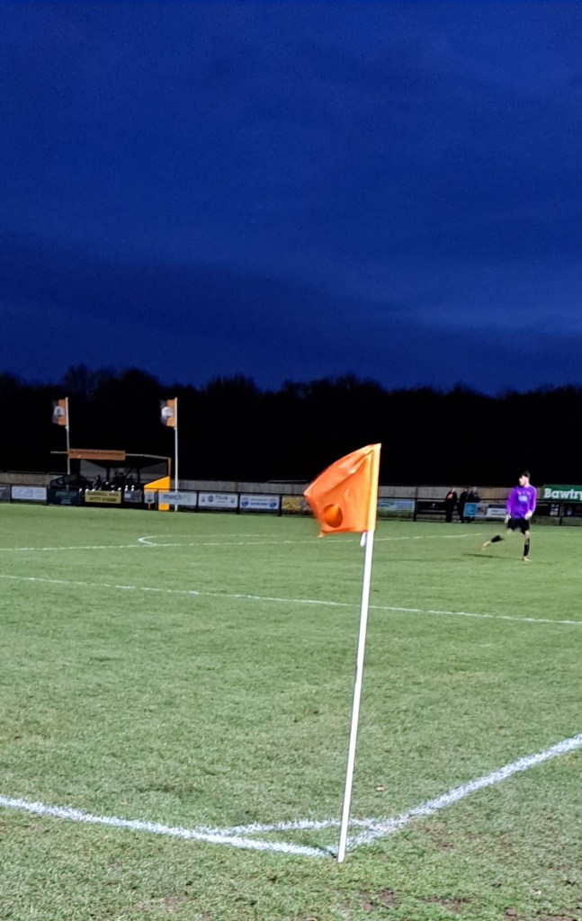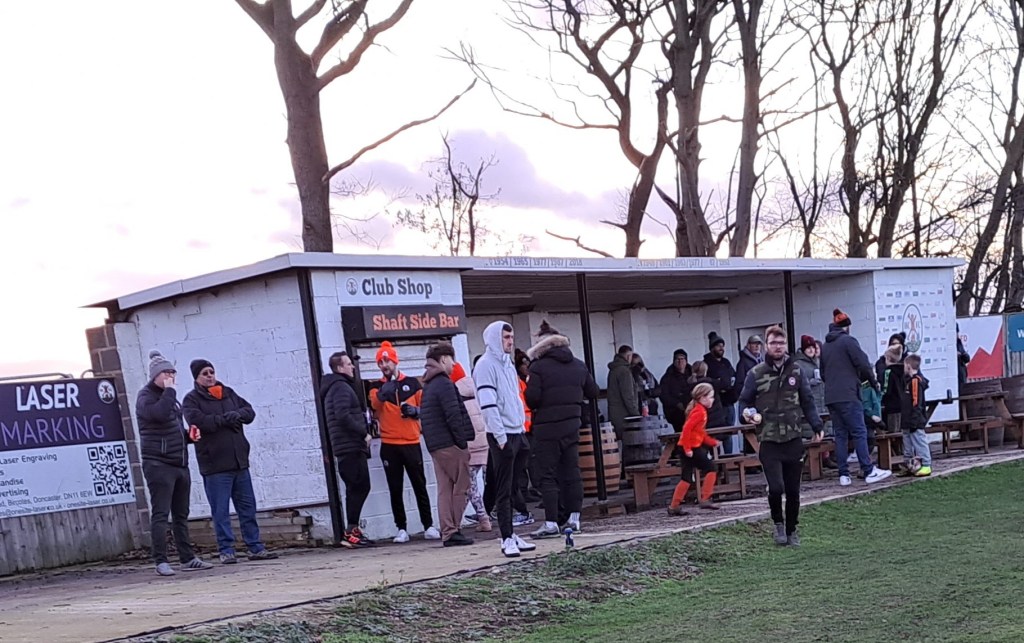 The land around here is very flat and on entering the ground this is continued with a lovely thick grass covered pitch. There are new LED floodlights, Toms tea rooms, a Shaft Side bar with outside fan zone, a small 50 seat covered stand on one side of the pitch mirrored by a similar standing area opposite. I’m sure the facilities go a long way in attracting the 118 hardy souls who were there to watch. You had to be hardy as the car temperature said 6 degrees but the biting strong wind blowing straight down the pitch cut you in quarters not half. This was despite the sunshine and clear blue skies.