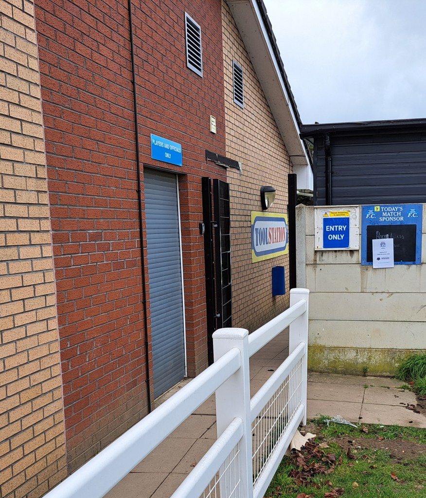 It was a very grey day with a hint of rain in the air that turned to drizzle by the start. The ground is next to a cricket pitch reached through a housing estate where you find ample parking. The neat ground has hard standing all round and on the side with the dugouts there is a seated covered stand. On the other side are a brick built changing room and hospitality facilities that have a bar and cafe, next to this is a modern building of offices and rooms to hire.