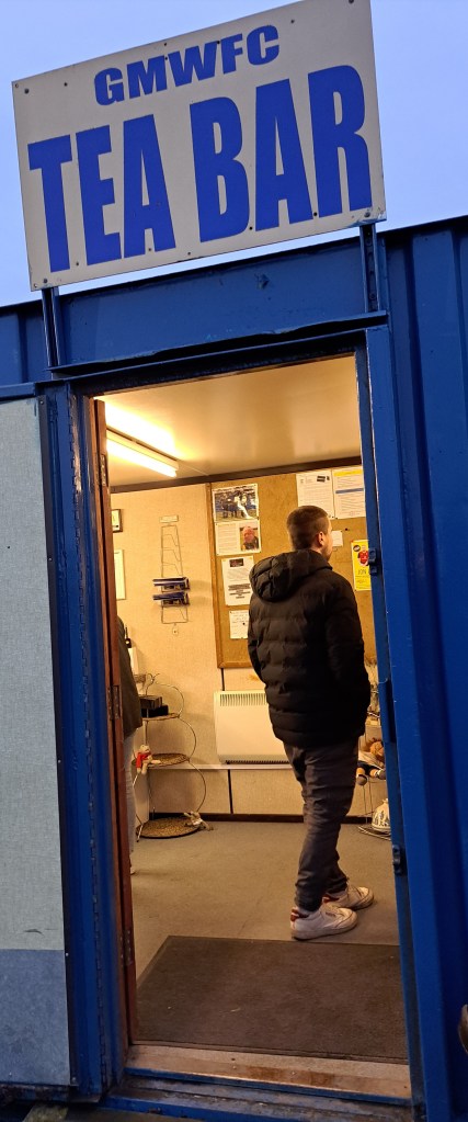Going through the turnstile I was greeted with a flat pitch that is showing wear all over. The ground felt hemmed in with some low roofed terracing with some having a single line of seating. Despite the clocks going back a few days ago it was dark and overcast by some heavy dark clouds.