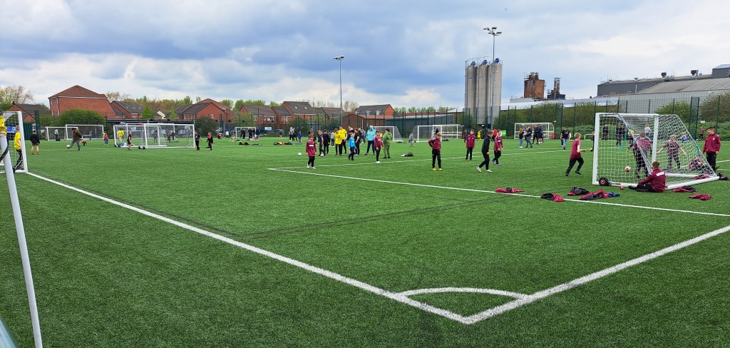 A pub and food outlets on the way to the ground had been occupied by a large contingent of good humoured Sheffield Wednesday fans on a spring afternoon where the high grey cloud was under attack from some blue sky patches. The fans seemed to be in high spirits and treating the day as summer despite it only being 10 degrees. Outside the stadium was Burton Albion Community Football Centre and nearby artificial pitches in use by fans prior to the match.