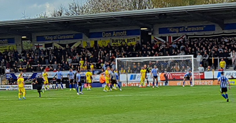 The Wednesday supporters packed in their end came alive but were silenced only 7 minutes later when a complete mix up trying to clear with headers meant the ball fell to Mark Helm who accepted the gift and stroked it into the net. Within 2 minutes it was Mark Helm again, who was having an outstanding match, who latched onto another poor clearance to steady himself, move infield and from 30 yards out smash the ball into the bottom left hand corner of the net for a 3.1 lead for the home side. Burton fans were in heaven and made all the noise up to half time.