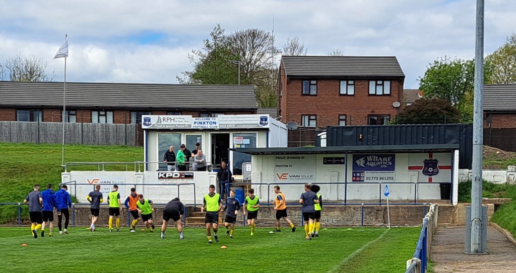Pinxton’s ground is very near Junction 28 of the M1 and you can see the stream of vehicles pass in the distance. It nestles amongst a housing estate with little parking except outside the houses. It is a picturesque ground on the side of a hill overlooked by St Helens Church and graveyard and looking out over the house rooftops to countryside.