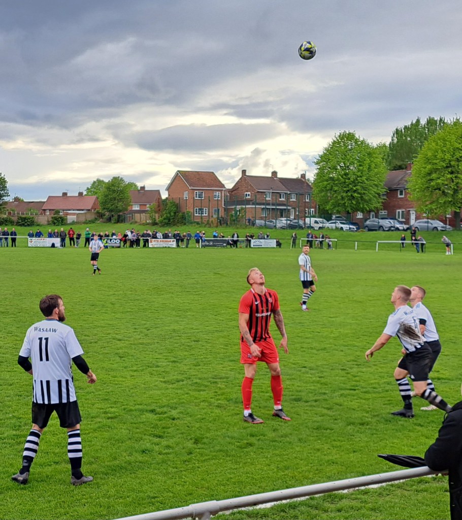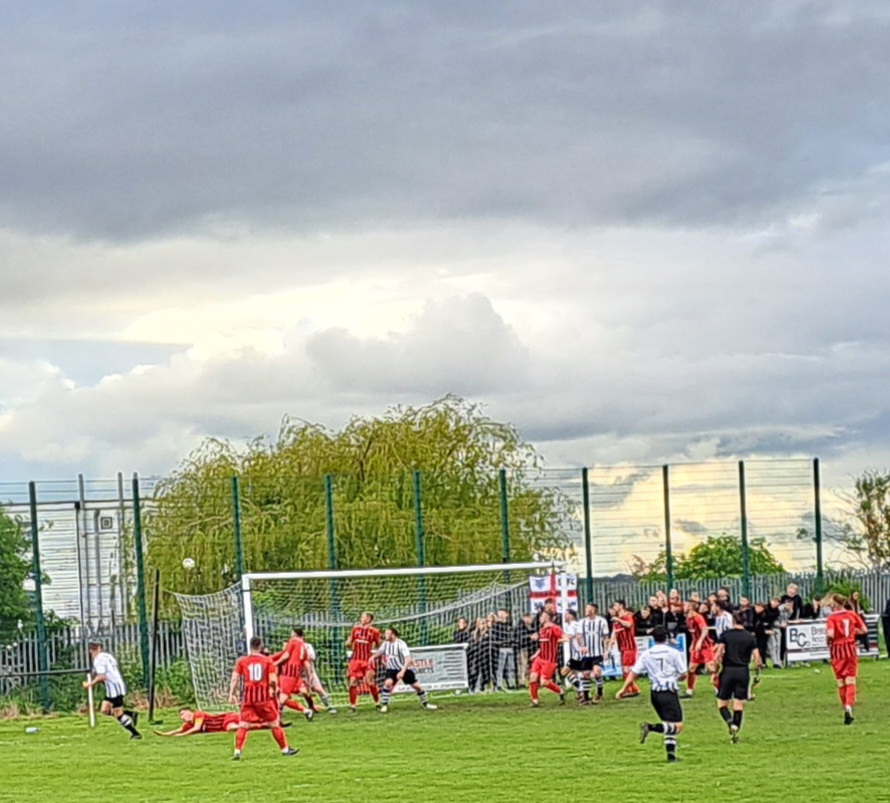 Dodworth seemed to draw on untapped reserves and kept themselves in the game when a few minutes later there was mayhem in the goal mouth after a corner and a Dodworth player manged to get a clear shot at goal for their second. News came through that Wombwell were now leading and they must have thought it would be their title when on 35 minutes a reckless sliding tackle meant the referee awarded a penalty to Dodworth. A long injury treatment on the penalty spot and some over the top protests to the referee and a linesman did not put the penalty taker off as he made it 3.3.