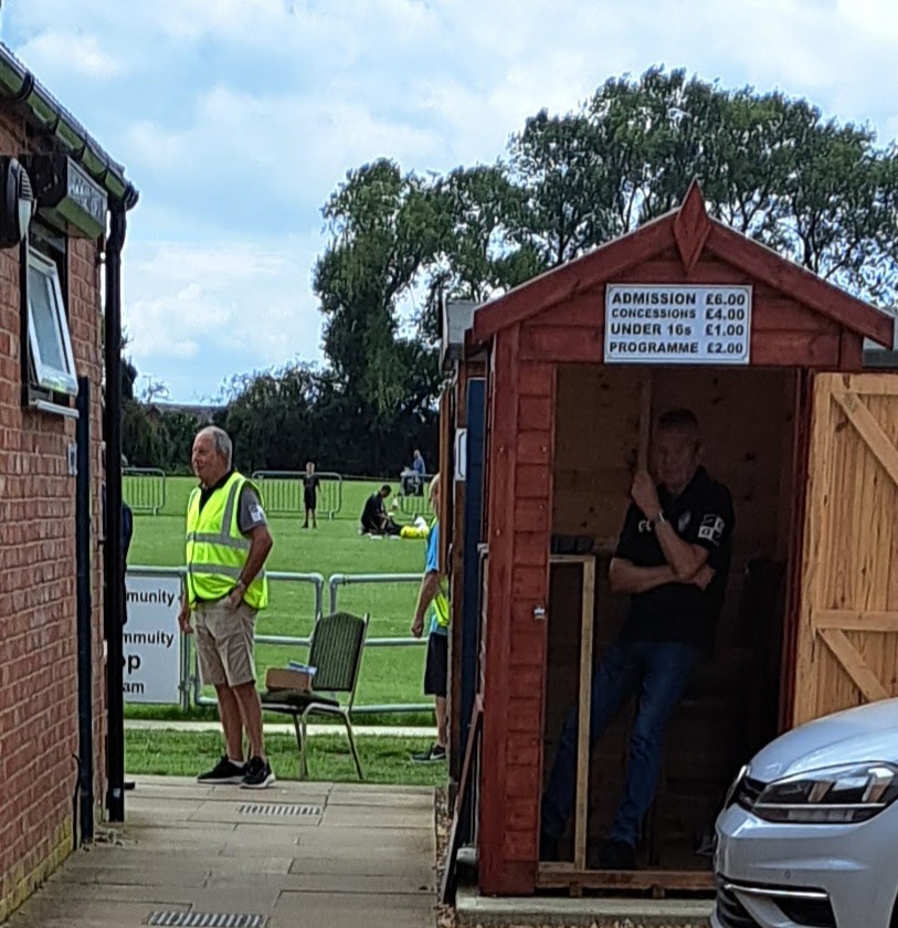 You walk through a large car park to an entrance that reveals an open stadium. To the left is a brick built changing room and club house, on the right is one side of the pitch that has a small covered stand with two rows of seating with a row of safe standing on the third tier. Although there is a perimeter path around the pitch three sides are open with fencing complete each end. What has been achieved to get to the ground grading standards to the higher levels is brilliant. The pitch was relatively flat with a thick grass cover looking vibrant green after the recent rain.