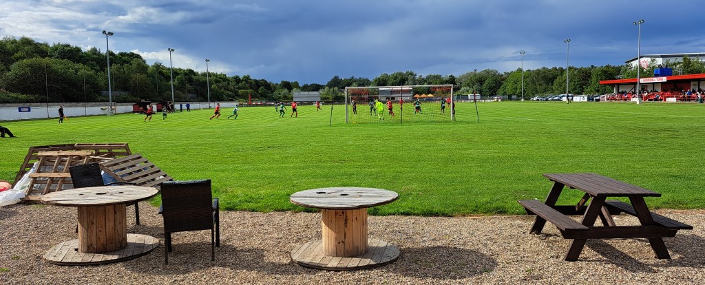 It was a warm 18 degrees, sunny but with white, grey and black clouds dotted around across the sky. A very flat pitch had great grass cover but as I said earlier the old running track made it all look a long way away.