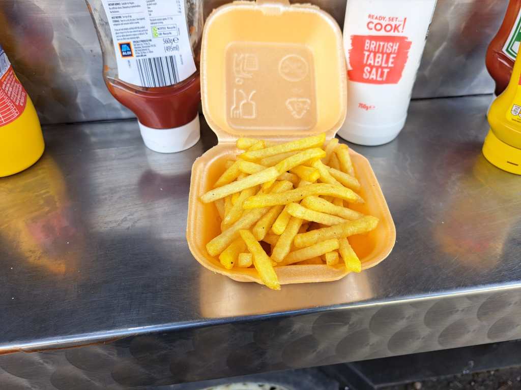 To the purist these were fries not chips. they were hot, just fried, tasty, crispy , golden, not greasy and had a good centre. The best this year to date and a score of 67.