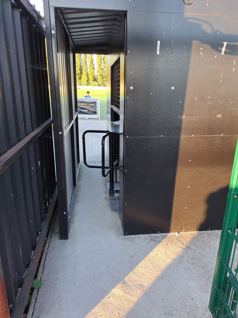 The facilities are a bit all over the place with a pitched roof one storey club house and flat roofed changing room on one side which also has a small covered seating area in the middle. There is another seated stand behind one goal and plenty of tarmacadam standing all round. I bought a coffee in the ample clubhouse but could not see anywhere to buy food, a serving place next to the bar was in darkness. The synthetic crumb pitch was very even.
