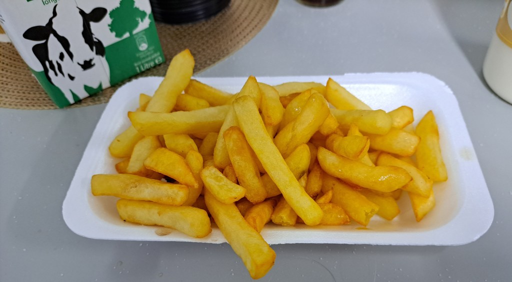 Siting behind the goal in the first half I kept seeing people walk by with chips. I explored at half time to find a food hut in the corner of the ground, the freshly cooked chips were hot, tasty, golden, crispy and didn’t taste of the greasy smell in the cabin. They were the best this season so far with a score of 70. For a price of £2 there was a good quantity, the large portions were immense.