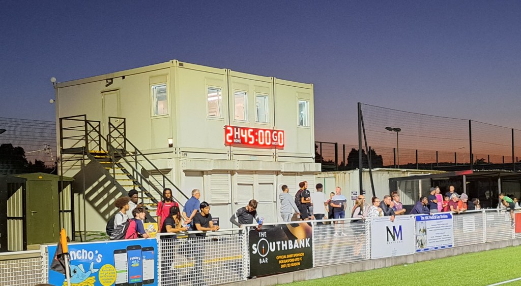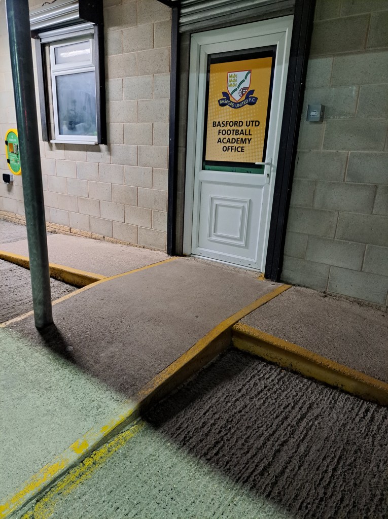 Basford has become part of greater Nottingham, North West of the city centre, at the end of the tram system and not far from the M1. Basford United’s ground is in a housing estate which when you drive into the ground opens up to a large carpark. There are training pitches one side and at one end a row of tall poplars trees and bushes that hide the passing Midland Mainline trains and the Nottingham trams.
