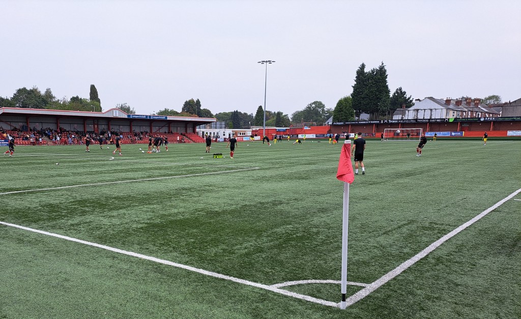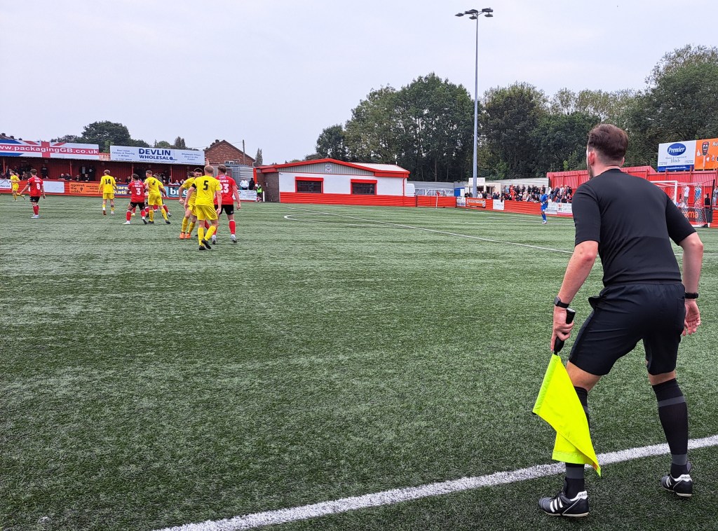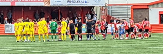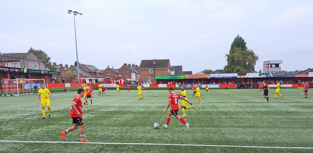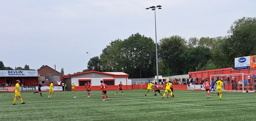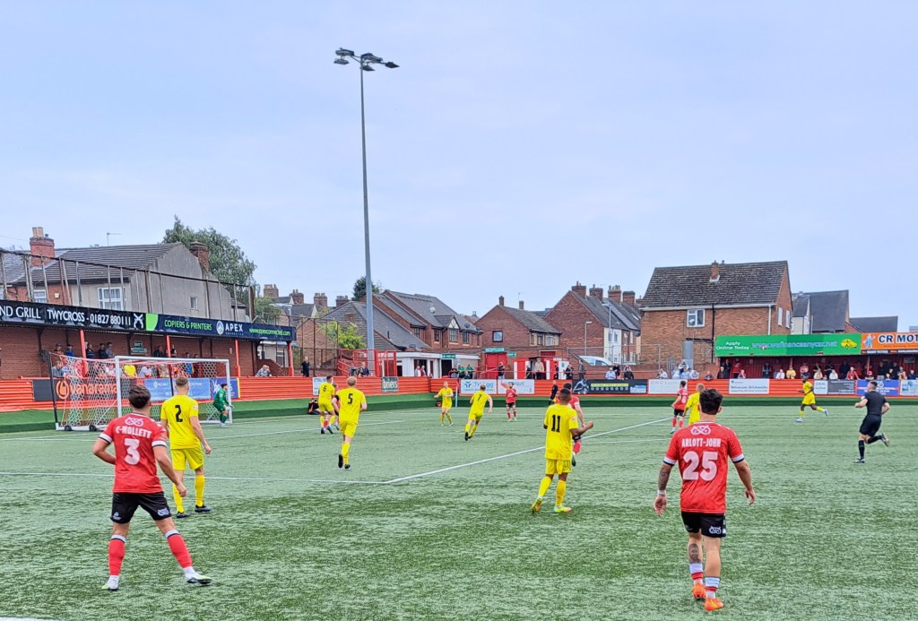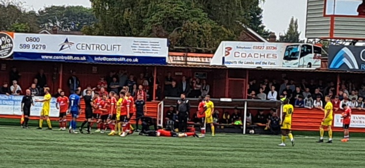 Tamworth played down hill in the first half and initial pressure led to them scoring from a corner after 14 minutes which was disallowed for fouling the Harborough keeper. Things looked grim for the away team when on 20 minutes the referee showed a yellow, then red card to their Connor Kennedy for what looked like kicking the ball away after a tackle.