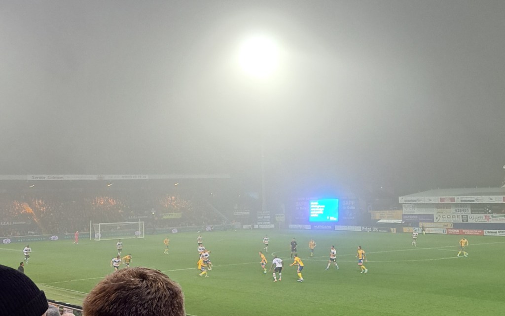 The match started at a frantic pace, end to end with Port Vale using Tommy Sang overlapping on the right and delivering tantalizing crosses that caused problems and one shot from one of his passes shaved the post after 12 minutes. Port Vale continued to show the greater endeavour and 12 minutes later it looked to me like a handball in the penalty area by a home defender to me but in the gloom I could have been wrong.