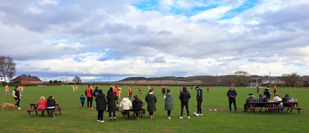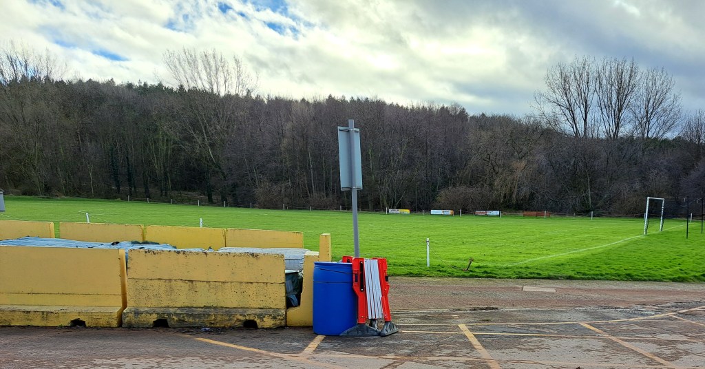 A small sports club with changing rooms, toilets, good parking, a bar, meeting room and football pitches. The pitch sloped from end to end with great grass cover, a bit undulating but drained well considering our recent weather. It was a mild 12 degrees with a blue sky and white clouds but with ominous grey clouds coming from behind. It was great to watch a match with no icy wind and cold feet and hands. The locals had used the picnic tables for an impromptu seating area.