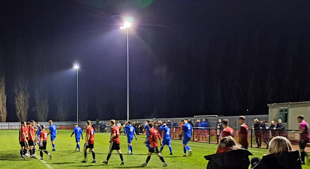 Fighting round the ring road in rush hour brings you to a small turning off a roundabout into Lenton Lane. This part of this busy road is more a country lane as it curves round next to the Trent to a sign pointing to Dunkirk FC. Like everywhere else I had to navigate the pot hole to get into the large nearly full car park that was pitch black. Drawn by sone lights in the distance I made my way to the club house and could see both teams warming up on some practice pitches. The ground was locked and everyone was heading like me to the large clubhouse with a bar for drinks and one for food. What struck me was how quiet it was, no music, no television and very little chatter. After coffee and chips I went to get into the ground but it was still locked and spectators waited outside before the floodlights were turned on at 19.33 and the gate was opened just after.