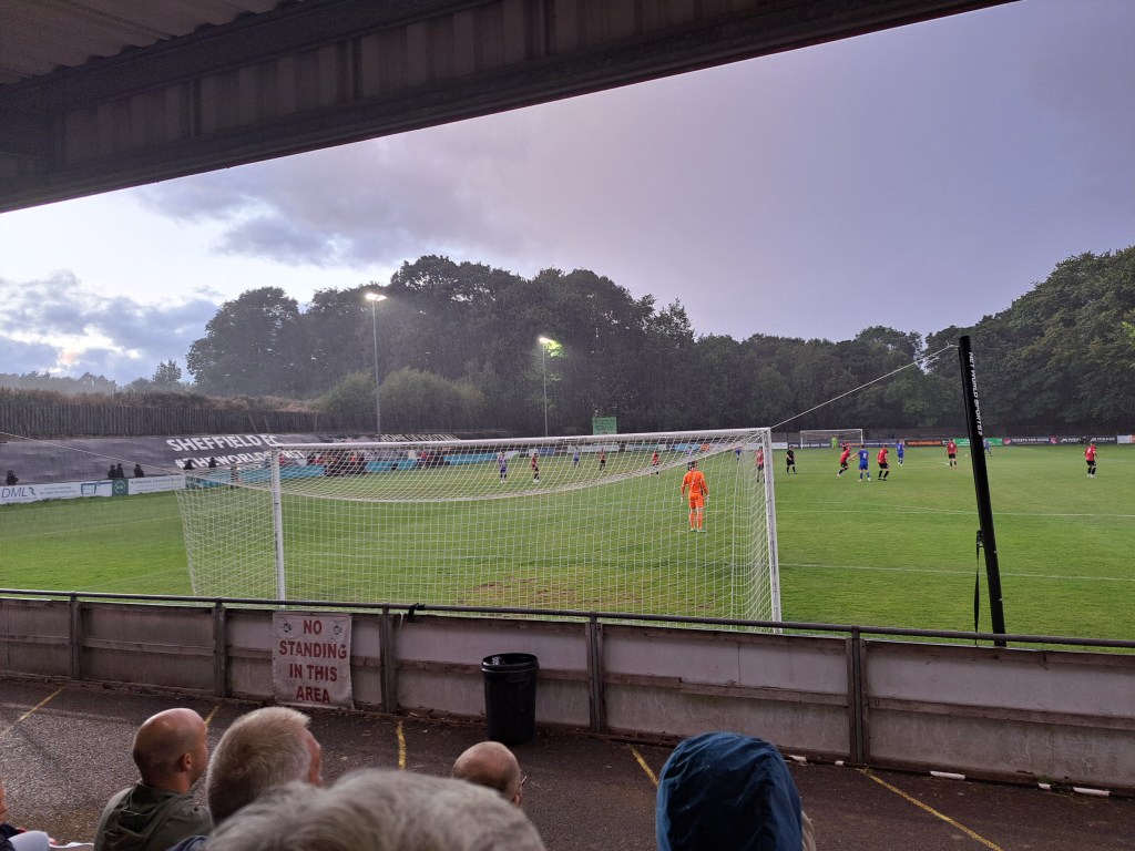 I sat in the only covered seated stand behind one goal to shelter from the wind and the torrential rain after 20 minutes of the game, which lasted for about 10 minutes. Others were under a covered standing area that runs down half of one side. The rest of the ground is open but sheltered by large trees at one end. A crowd of 243 was disappointing considering local rivals Hallam had 700 on Sunday for an FA Cup match but hopefully if their move back into Sheffield succeeds they have a chance to build a local community fan base to rival their world wide one in the same way Hallam have.