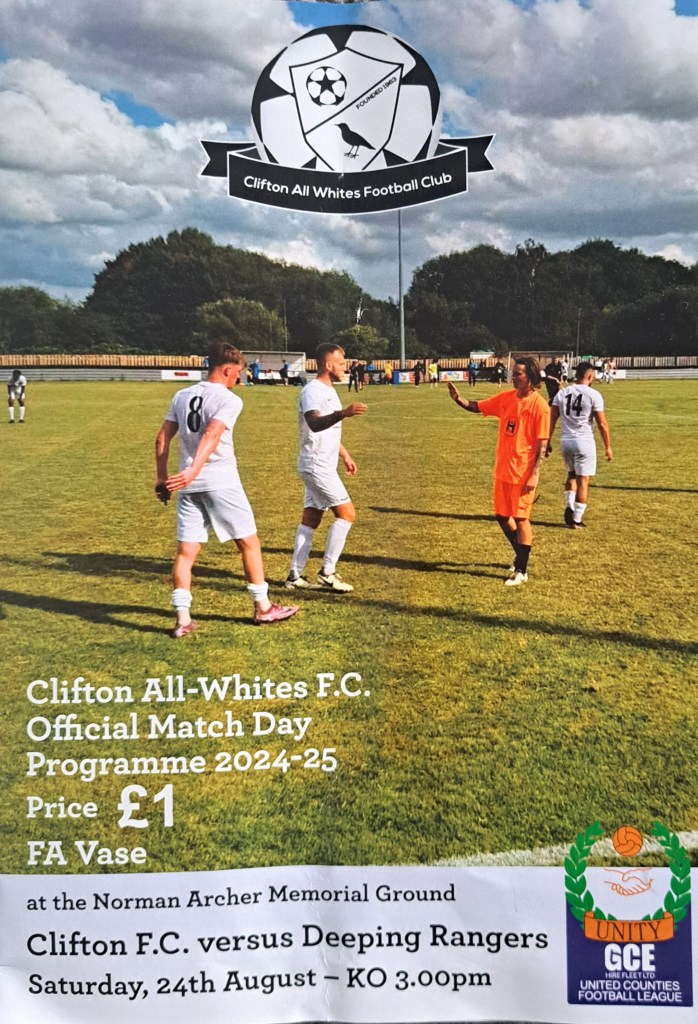 Clifton All Whites, United Counties League 1 (10th in league) Deeping Rangers, United Counties Premier North (19th in league). All Whites v Rangers.