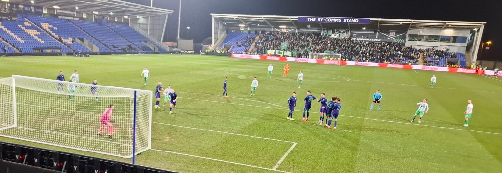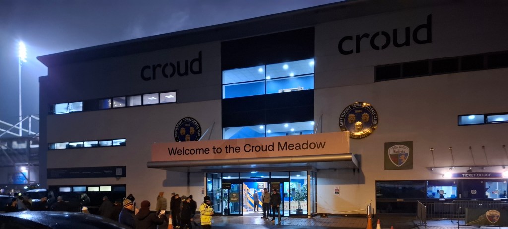 The Shrewsbury stadium is modern with covered seating on all four sides with a flat grass pitch that has hardly been cut up at this point of the season. The drizzle of the day had luckily stopped for the game.