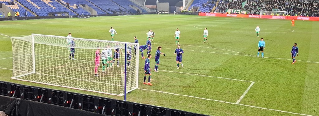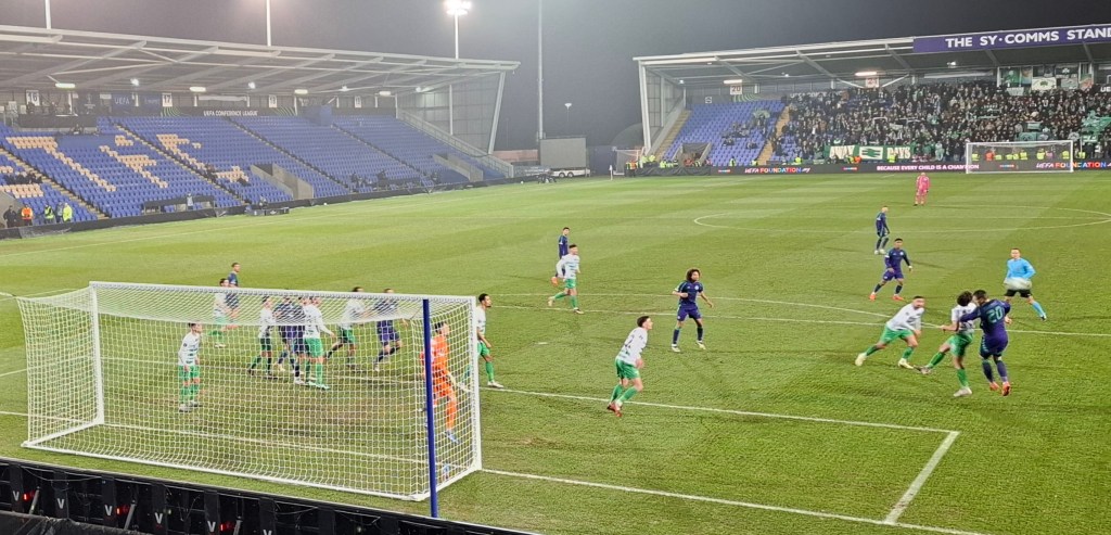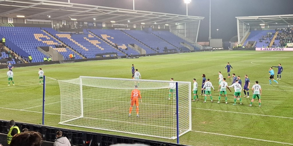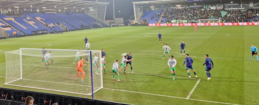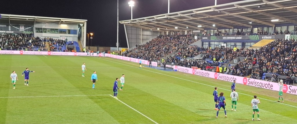 I headed west on a miserable, grey, drizzle ridden day with a temperature of just 6 degrees. I was headed for Shrewsbury, where ‘The New Saints’ were playing Panathinaikos in their latest European Conference League game. £16 had secured me a ticket, a lot less than other UK clubs playing in Europe. The game was being played in Shrewsbury due to the fact that their ground in Oswestry did not meet the UEFA standards, Shrewsbury FC is only 21 miles from TNS’s ground.