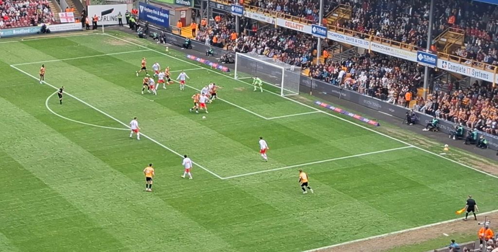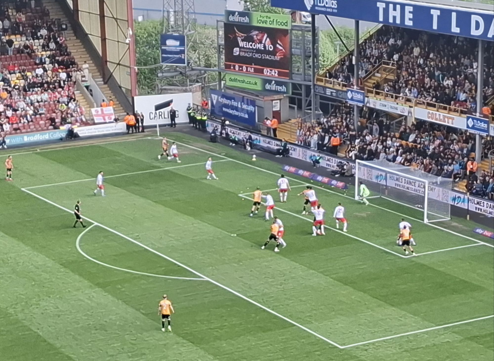 Bradford continued to press forward, but their high balls were easily dealt with by Fleetwood’s big back four. Some wing play, particularly from the left and long throws from their right back, did cause the most angst for Fleetwood.