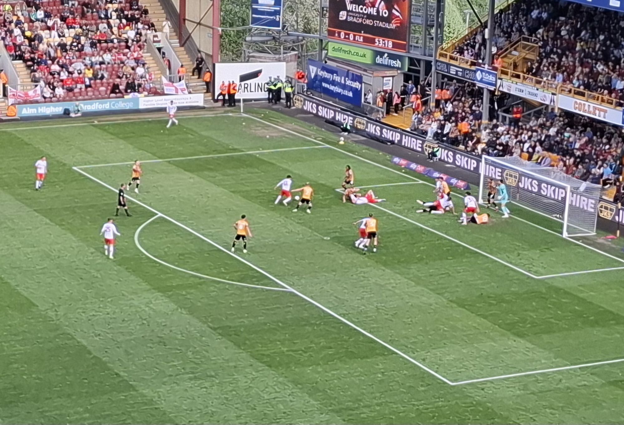 After the first 15 minutes, the Bradford fans had quietened due to the tension, and just 8 minutes later it was Fleetwood who had the first real chance of the game, which was blocked and cleared by defenders. Play was continually interrupted with injuries, and on 35 minutes, the teams took advantage with a drinks break.