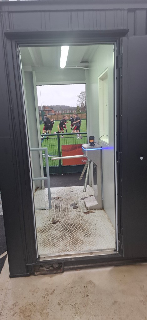 The new artificial pitch had a small covered seated stand on one side almost adjacent a small covered standing area. The ‘Club house’, changing rooms one end, and open on the other side and end Parking , main road around 2 ends other playing pitches.
