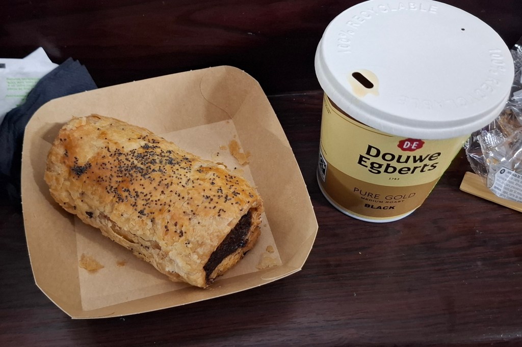 No Chips but a very large sausage roll with very little pastry. It was tasty but had no hint of Hendersons Relish which it was advertised to have.