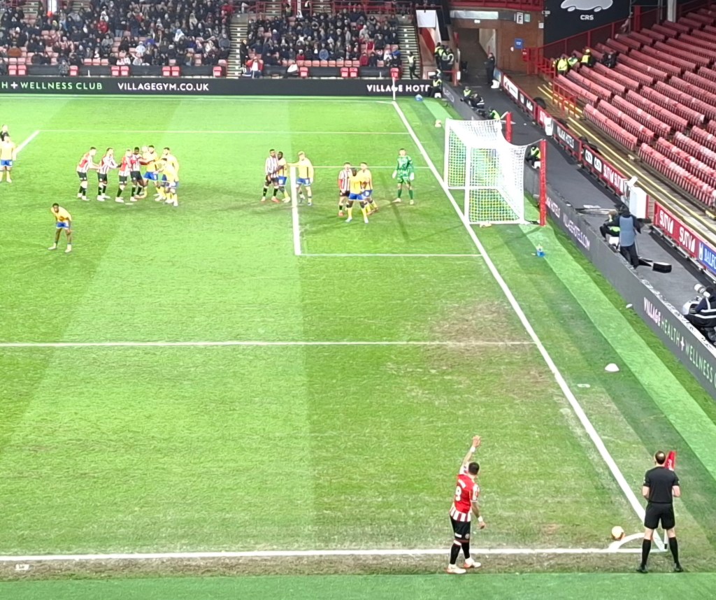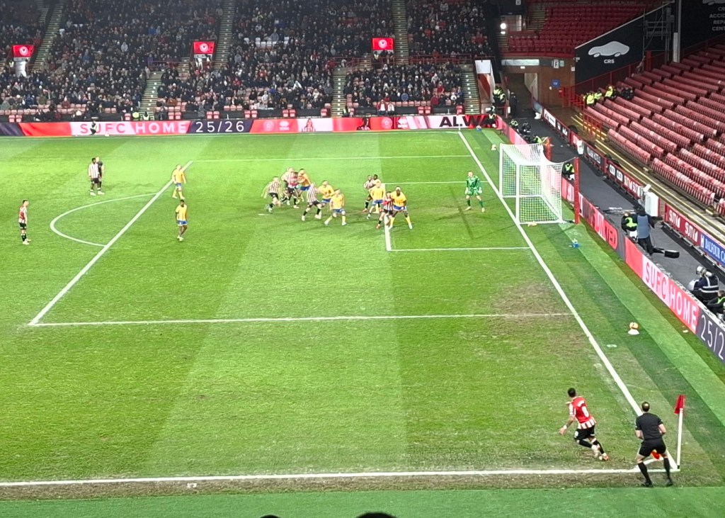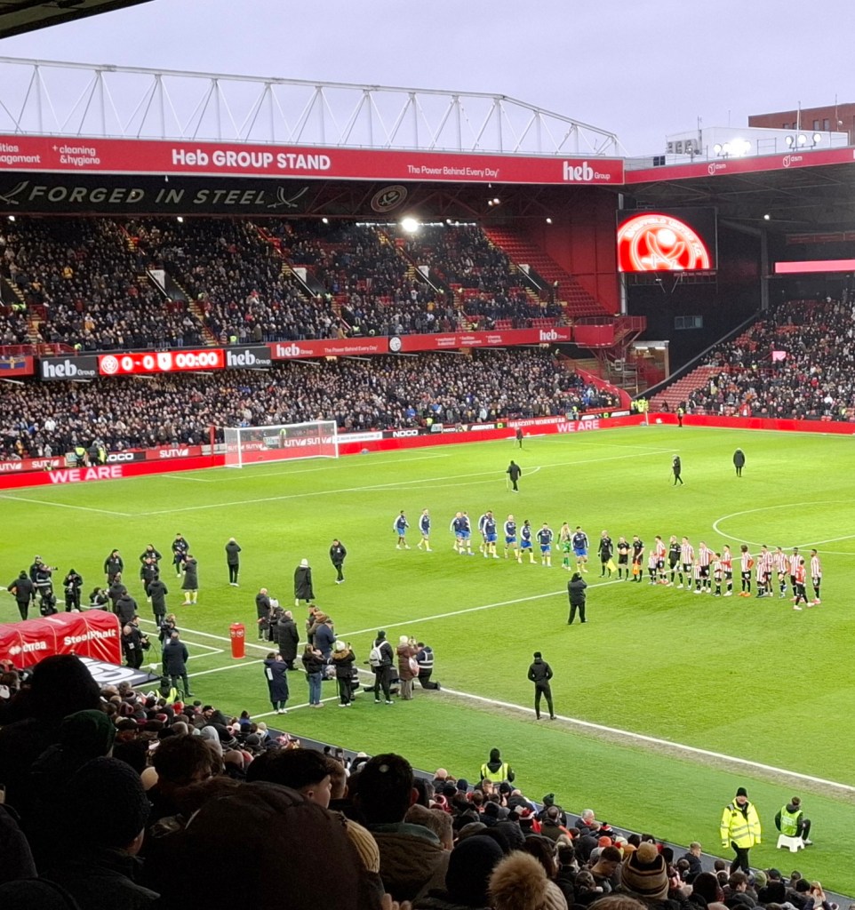 With storm Goretti and the cold snap that followed, having left snow and ice, the Non-League games in my area were mostly postponed. Looking for an alternative I was lucky to find the FA Cup third round match between Sheffield United and Mansfield Town. The added bonus was that all prices were drastically reduced to encourage a crowd on a cold mid Sunday afternoon with other games competing on TV. Most people would also have presumed that it was a non attractive fixture with Mansfield sitting in mid table in a division below United. With a lot of games to pay for in the 24 team Championship, and this game not part of those who had already paid for a season ticket, the reduction was a great idea. back at the start of the season I had watched Sheffield FC play in the early extra preliminary round.