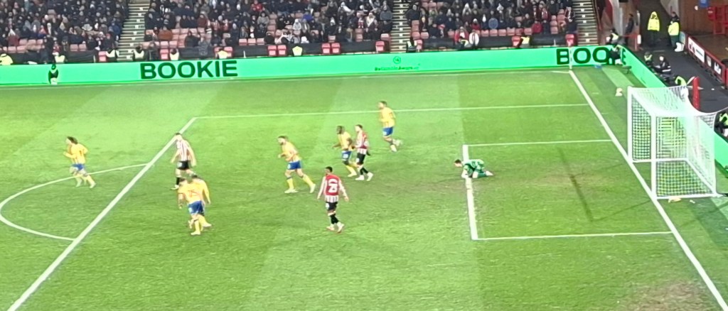 The first 9 minutes were all Sheffield united but it was Mansfield who had the best chances when two shots were tipped over the bar by the home keeper. On 12 minutes Mansfield were ahead when a corner was headed out by United’s defence straight to ex Sheffield player Lewis Reed who hit it straight back, and the ball looped over everyone into the back of the net. But the Blades hit back quickly when with 19 minutes gone Gustavo Hamer received the ball on the edge of the goal area, he turned, made space and curled a beautiful shot into the top left hand corner of the goal.