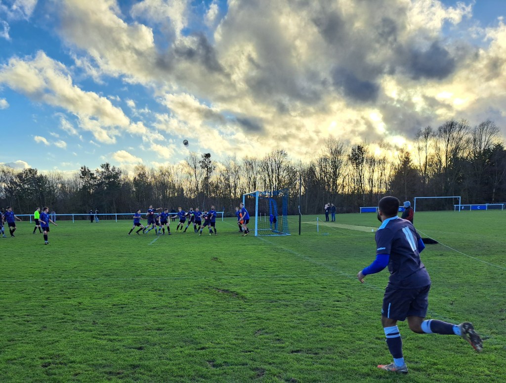 As halftime approached the thick black skies dropped their predicted rain but the shower only lasted for a few minutes and held off for the rest of the match. Clay Cross’s efforts were not dampened and just before the break a free kick from the left was headed down and amongst a group of players Gracjan Klimczak squeezed it into the net to equalise. Halftime 1.1