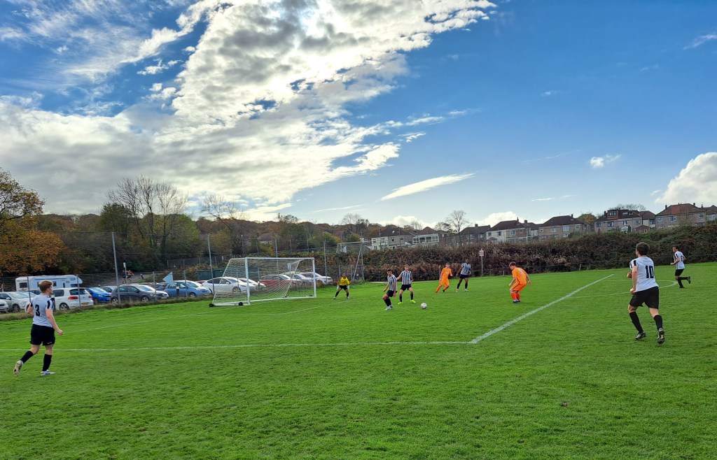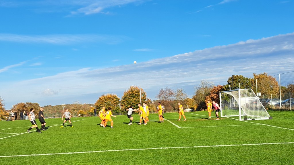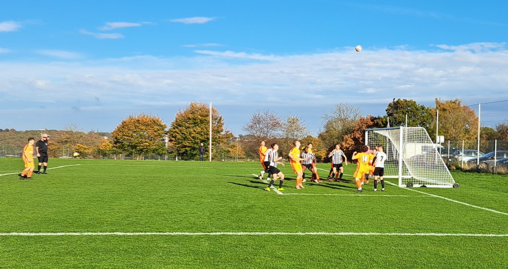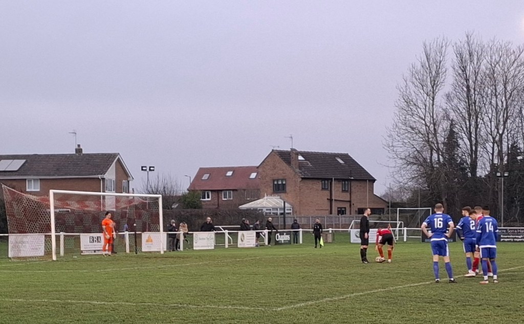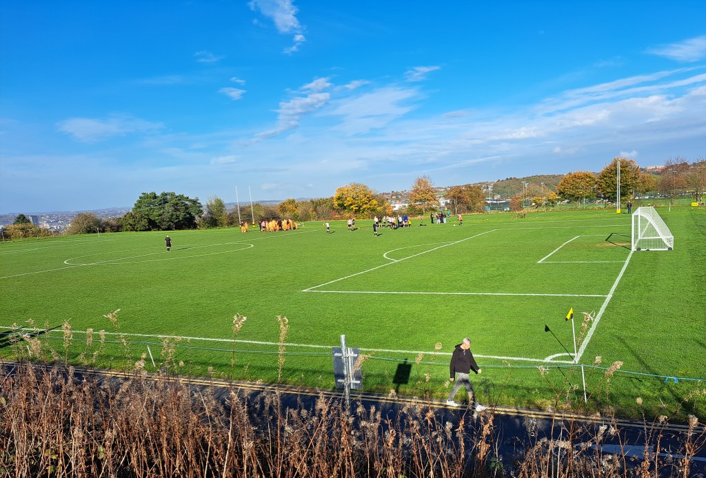 It was a very sunny afternoon with clear skies and the temperature rising above 15 degrees. The all grass pitch which famously slopes from one end to the other looked in great condition apart from some sanding in the goals.