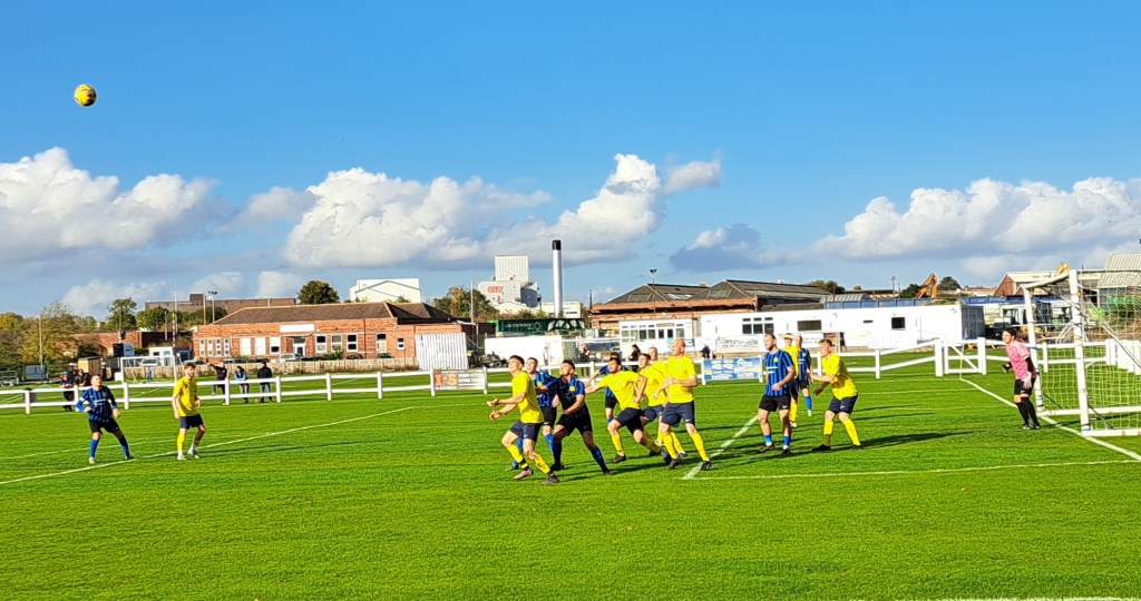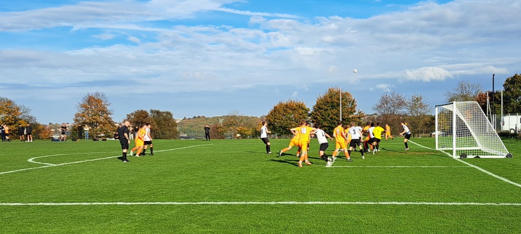 St Albans started with some forays down the wings, but no end product and Farnborough’s favourite and most effective tactic was a long throw into St Alban’s penalty area. These were well dealt with by the Saints defence and Michael Johnson in goal, who was my man of the match with a no-nonsense, competent game.
