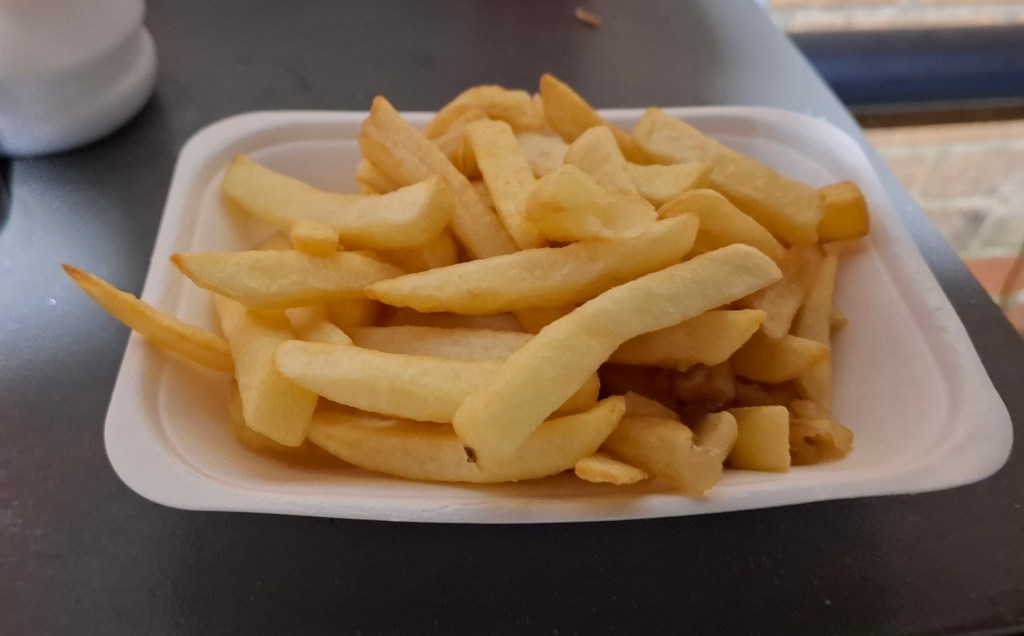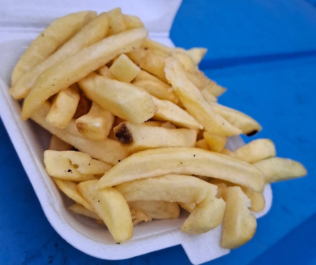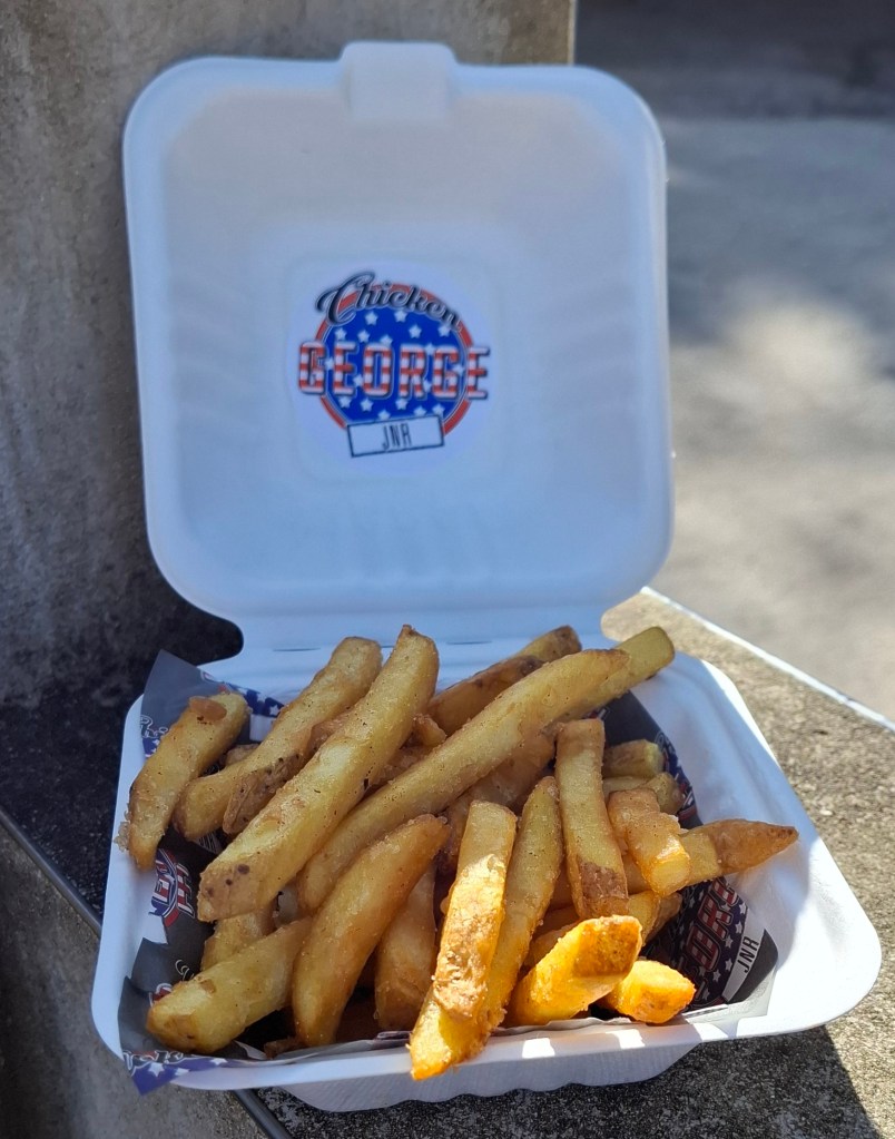 The chips, From ‘Chicken George’, were hot, golden, crispy, soft in the centre, tasty, but the more you ate, the more the seasoning that had been added ruined the experience. Why don’t hey let you add your own salt. What could have been a winning score in my chip league for this season was reduced to a disappointing 65.