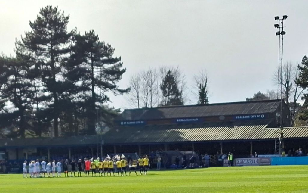 An early start from North East Derbyshire down the M1 to Loughborough to my daughters, who then drove us to my son in Northampton. Change cars again, and we were on our way to St Albans to see them play Farnborough.