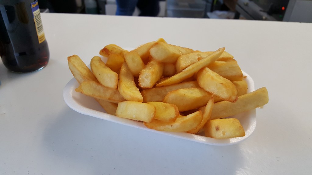 But on evening games if not in a rush we would get a portion of chips and a pea cluster from a chip shop in Duston, Northampton, scrummy. If you have time visiting Villa Park the Villa Chippy on Manor Road is a well priced good quality offer which you will have to queue for and that tells all.